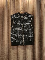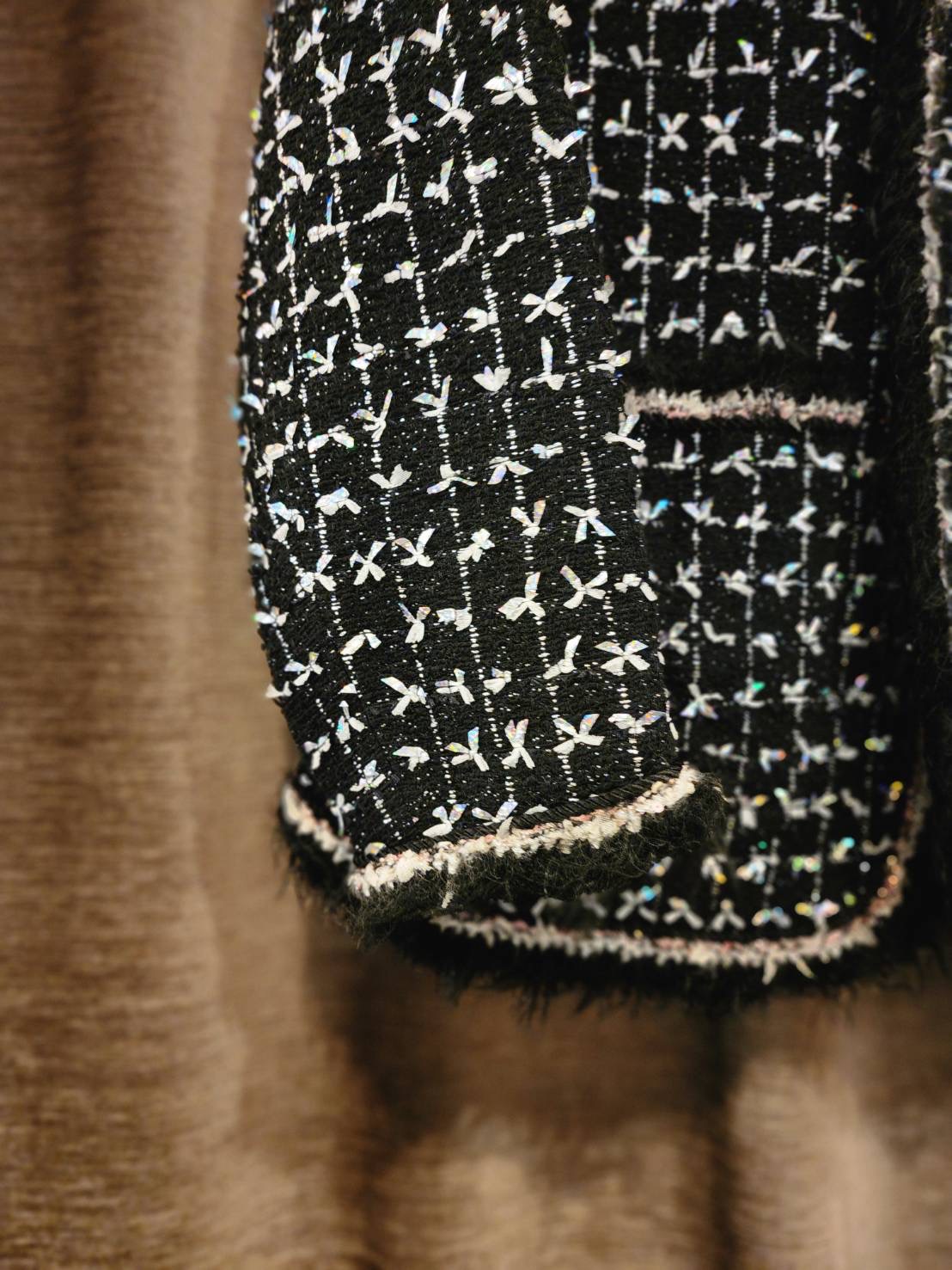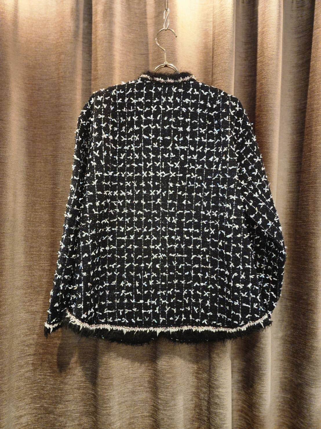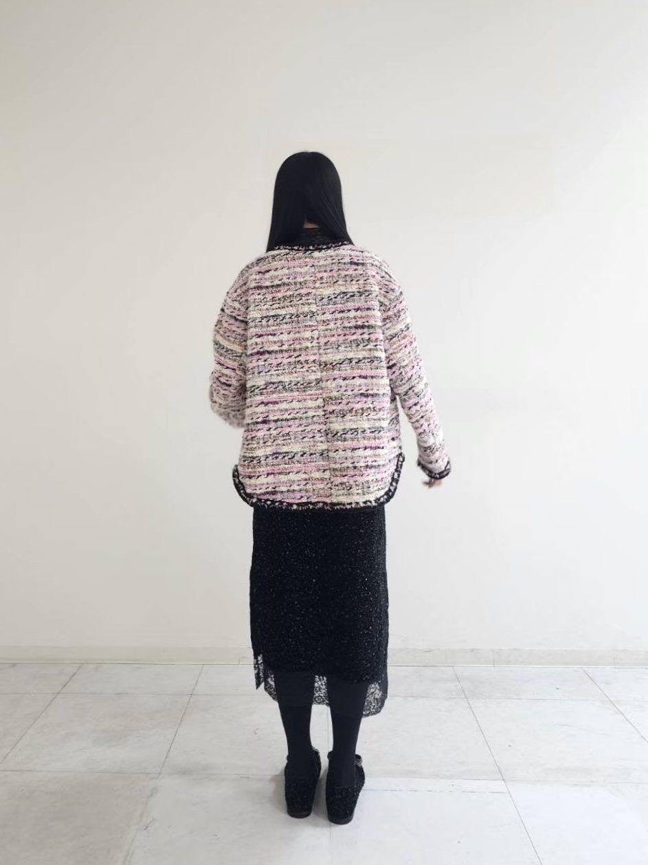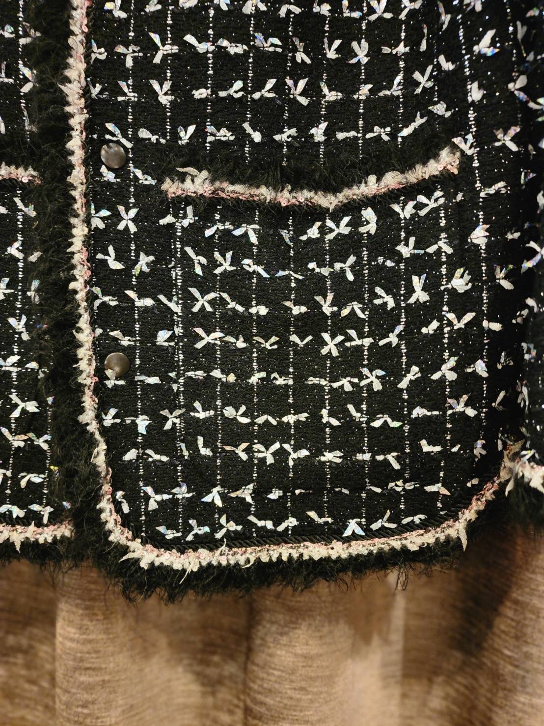 フランスのマリア・ケント(MALHIA KENT)社のツイードを使用したジャケットです。襟ぐりから前立て、袖口やポケット口のトリミングには全て手編みのブレードが施されており、細部にわたって丁寧な手仕事のぬくもりが感じられます。