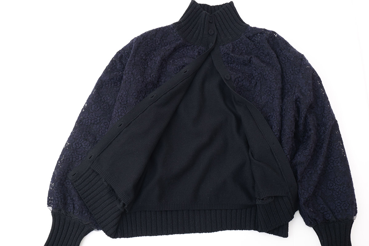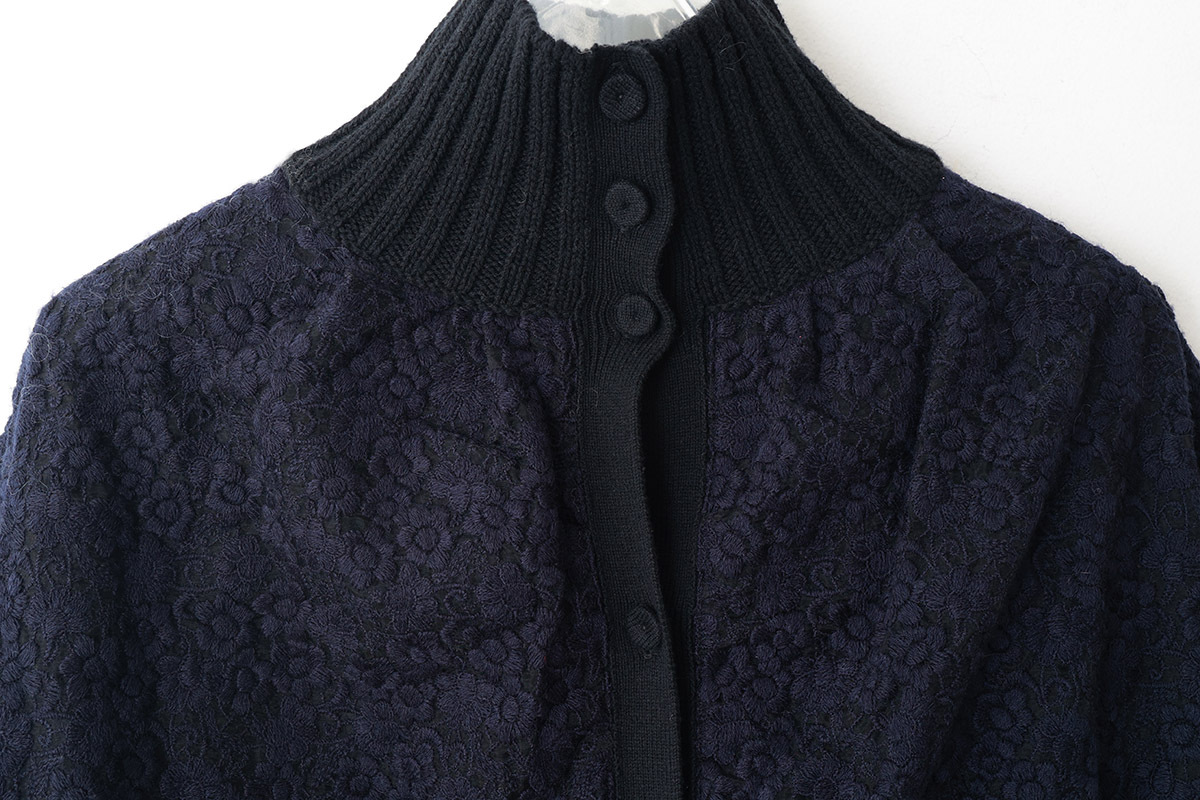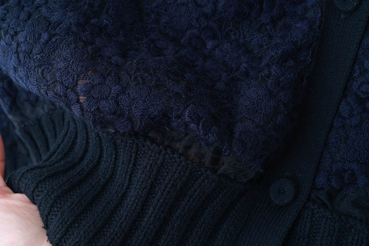 フラワー刺繍が施されたオーガンジーと内側がニットの組み合わせの、カーディガンのようにお召しいただけるブルゾンです。