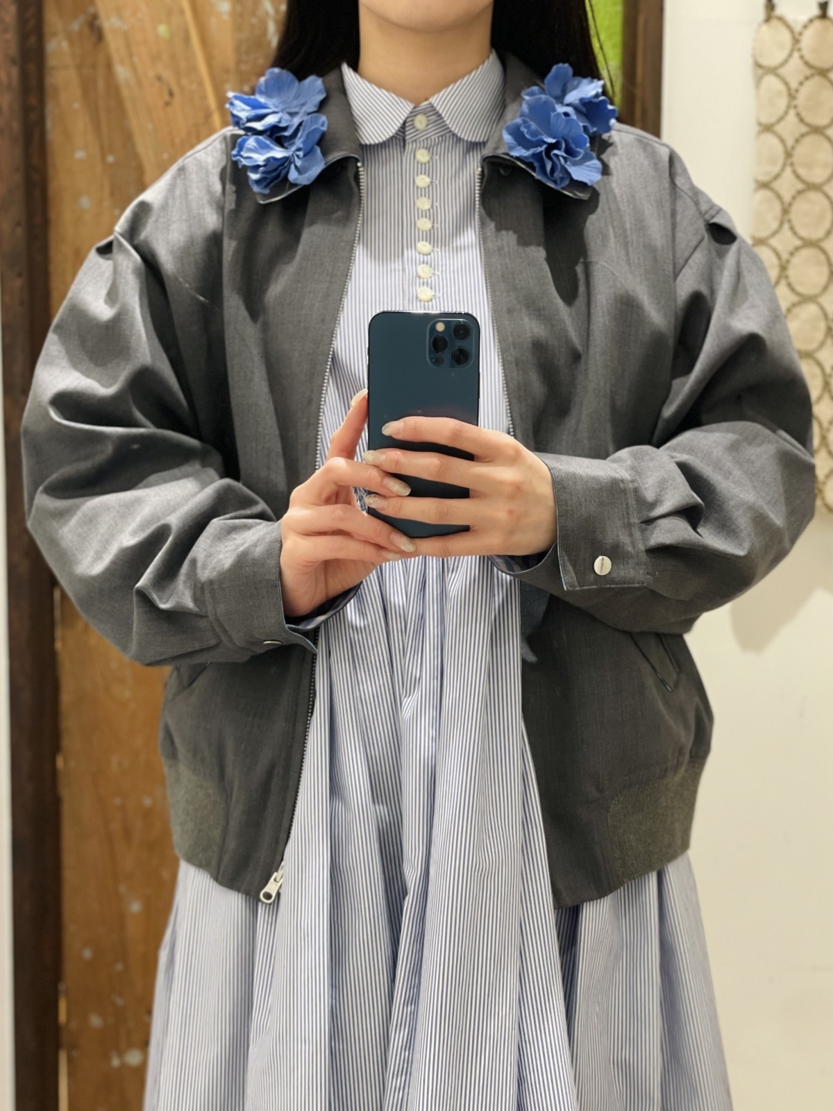 レトロな表情のスウィングトップブルゾン。コットンのギンガムチェックとのリバーシブル仕立てで気分によって表情を変えられます。編み立てた衿にレザーライク素材の可憐なコサージュが施されています。同素材を使用したレースショートウールパンツとのスタイリングもおすすめです。