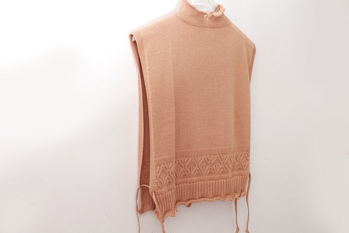 秋口から活躍しそうなベストです。下にカットソーやハイネックのトップスを重ねてのコーディネートがオススメ。首元や裾にほどこされたスカラップがかわいらしい印象に。前後で着用ができます。