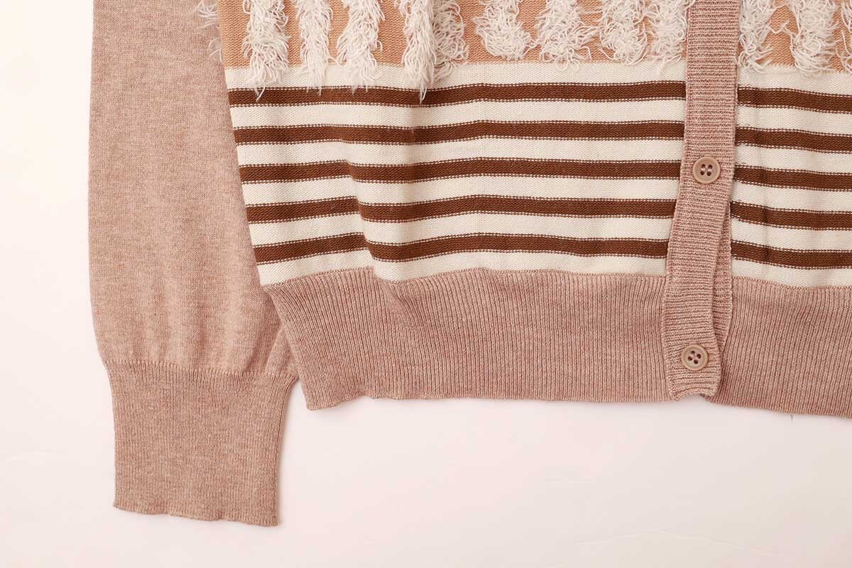 前見頃はフリンジとストライプの組み合わせが楽しいニット、後ろ見頃はプレーンなハイゲージニットのカーディガン。