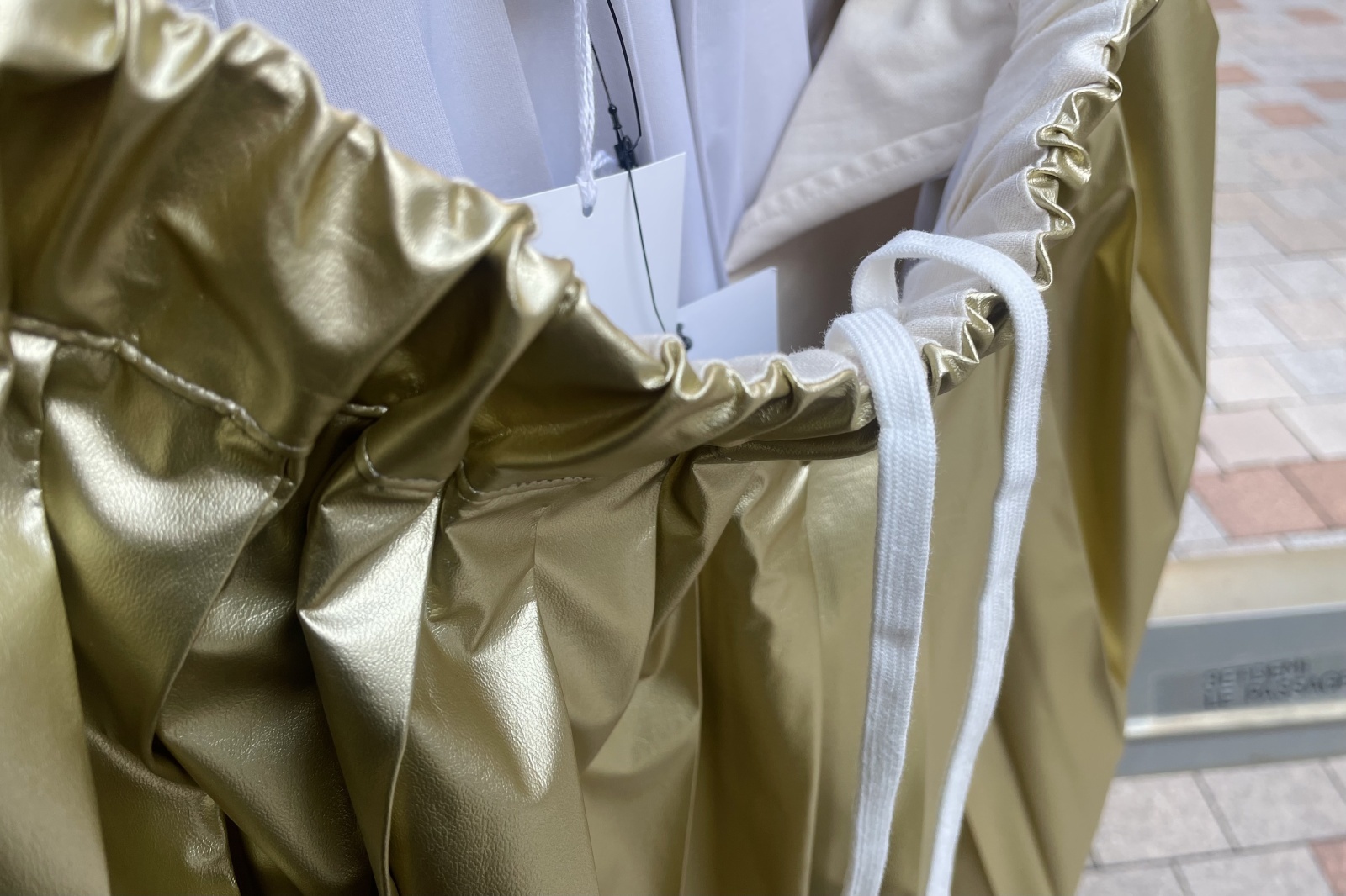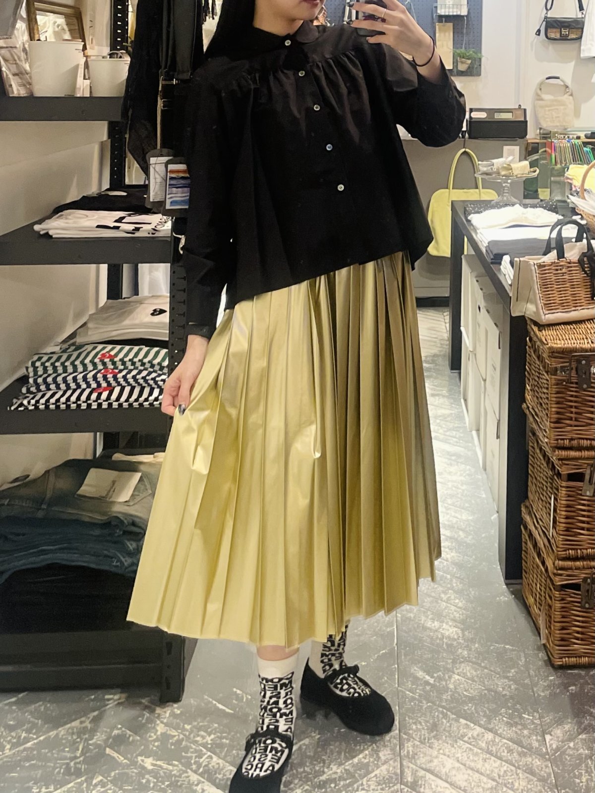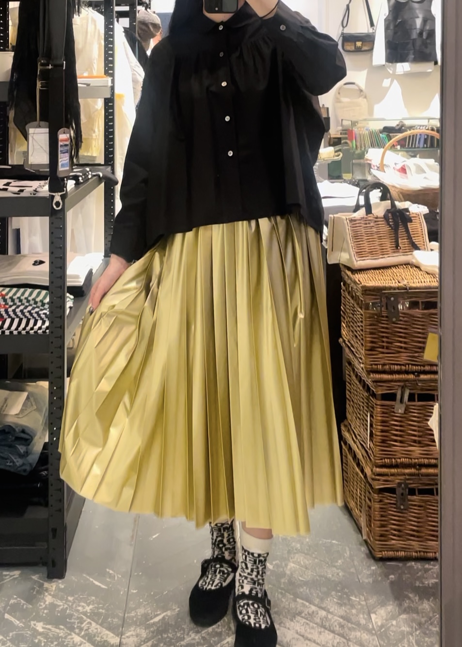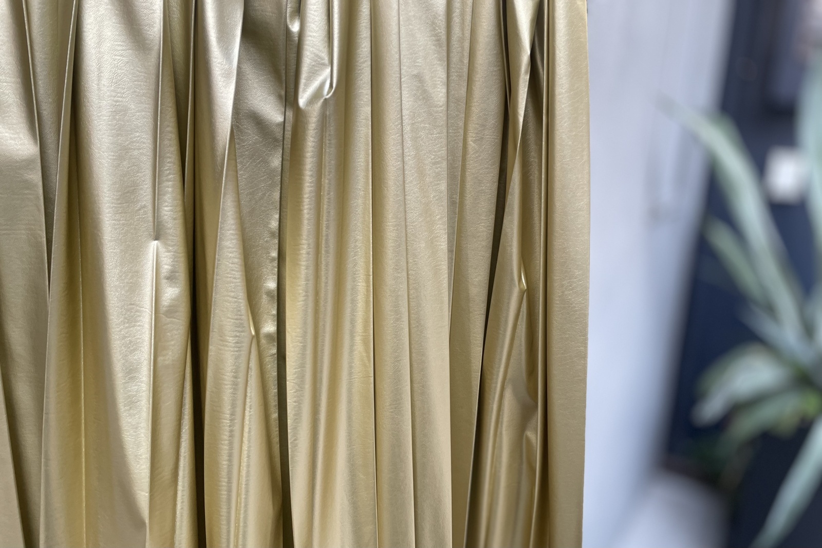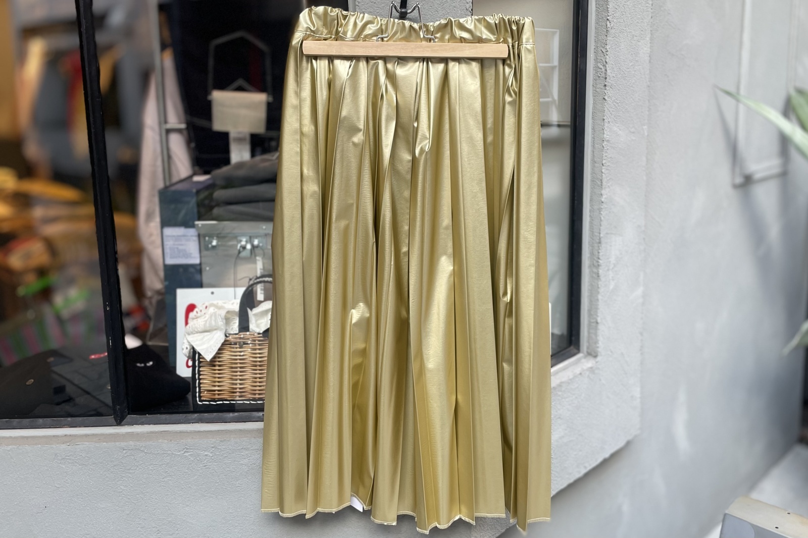 ベーシックなシルエットのプリーツスカート。マットな光沢感のゴールドカラーがコーディネートのアクセントになります。細かいプリーツが動くたびに綺麗なスカートです。ウエストは紐で調節可能。ポケット付きでシンプルな履き心地です。