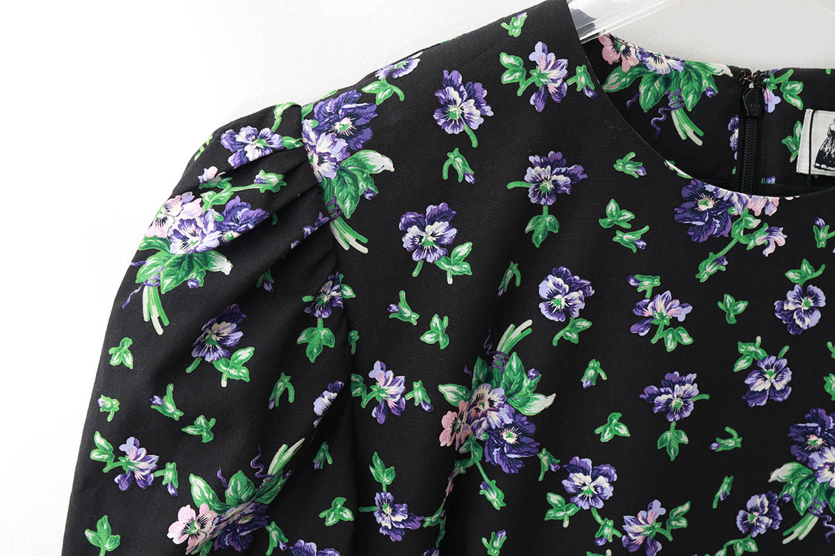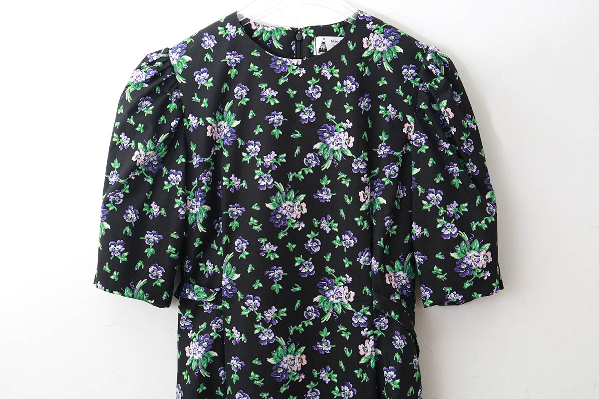leur logetteアーカーイブのフラワープリント生地でショップ別注のワンピースをお作り頂きました。パフスリーブにIラインのシルエットで、体のラインが美しく見えます。シンプルに一枚で着るだけで、華やかな雰囲気になります。