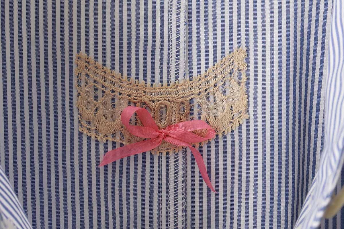 ポケットの内側や裾の内側にあしらわれたレースや、SサイズとMサイズで色が違うブランドタグのリボンなど、こだわりがたっぷり詰まった特別なワンピースです。色違い、柄違いもございます。