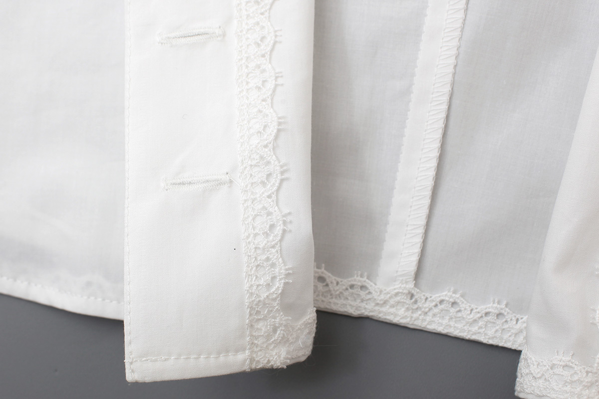 内側にあしらわれたレースや、SサイズとMサイズで色が違うブランドタグのリボンなど、こだわりがたっぷり詰まった特別なブラウスです。デザイン性が高いので、シンプルなコーディネートでもサマになる一枚です。同シリーズの柄違いワンピースもございます。