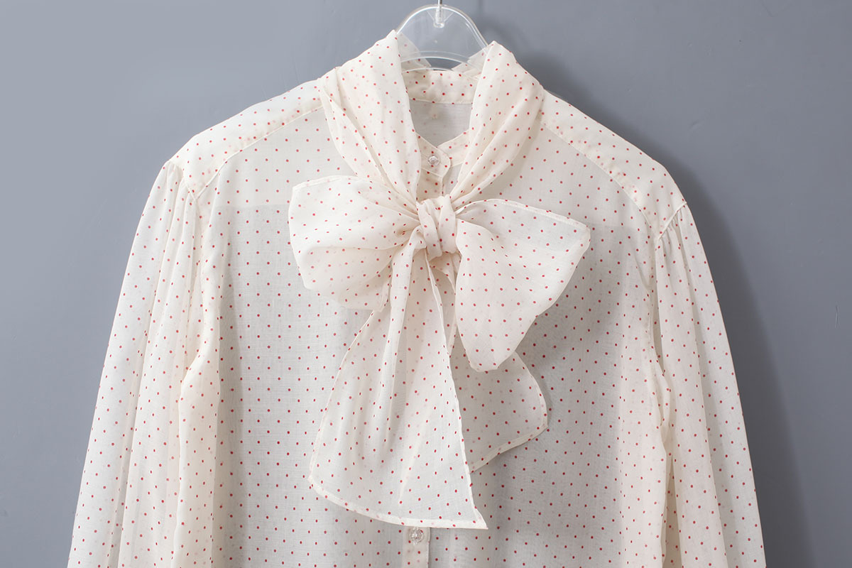 春らしい軽やかなシアー生地に細かいドットがプリントされたレトロなボウタイブラウス。