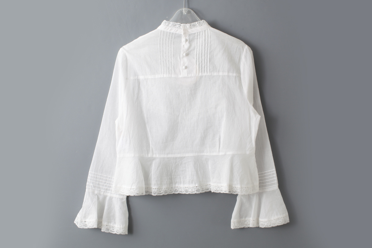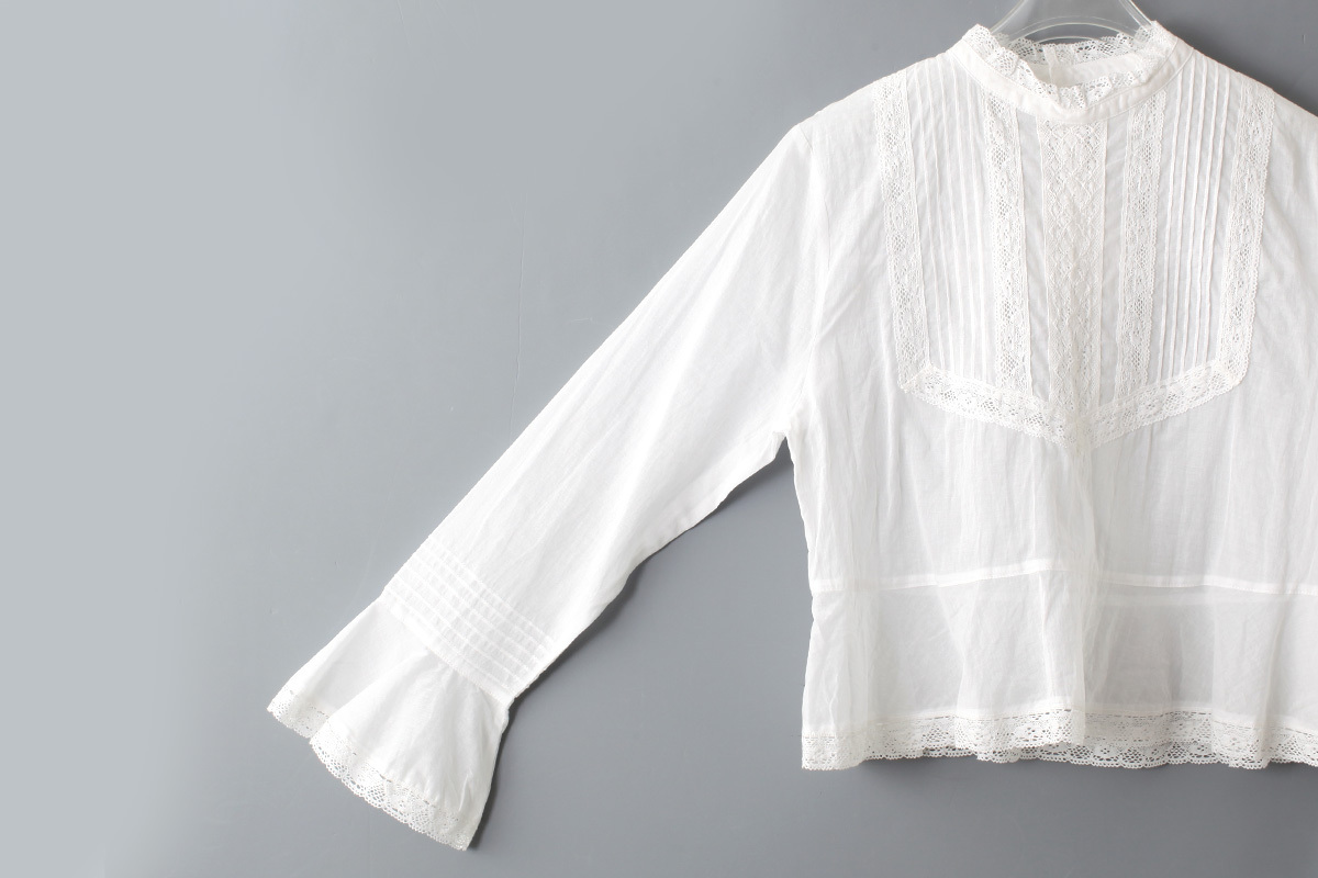 繊細で軽い生地で、ヨーク部分や袖にはピンタックとレースをふんだんに施されており、ヴィンテージのような雰囲気に。