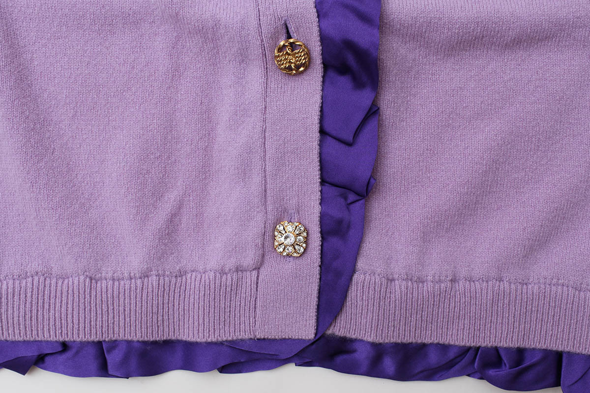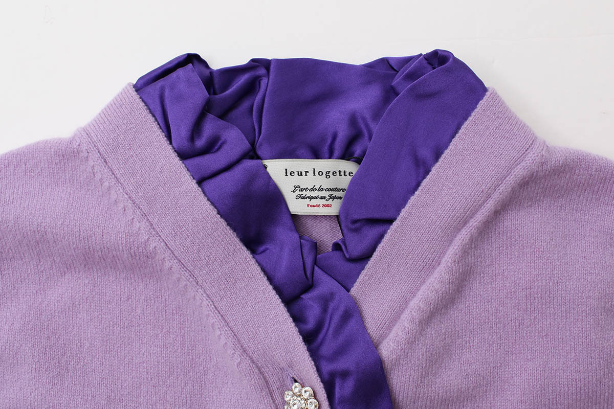 ストレッチ糸と一緒に編むことで、ふっくらとした立体感と柔らかな弾力があり、着心地の良さはもちろん型崩れしにくく美しいシルエットを保ちます。 首元にはシルクサテンのフリルをあしらい、肌あたりの良さに加え、ビジューのボタンが華やかで上品な印象に。 アウターとのレイヤードもしやすいコンパクトなサイズ感です。 上質な素材と上品なディテールが織りなす、贅沢で心地よい一着です。