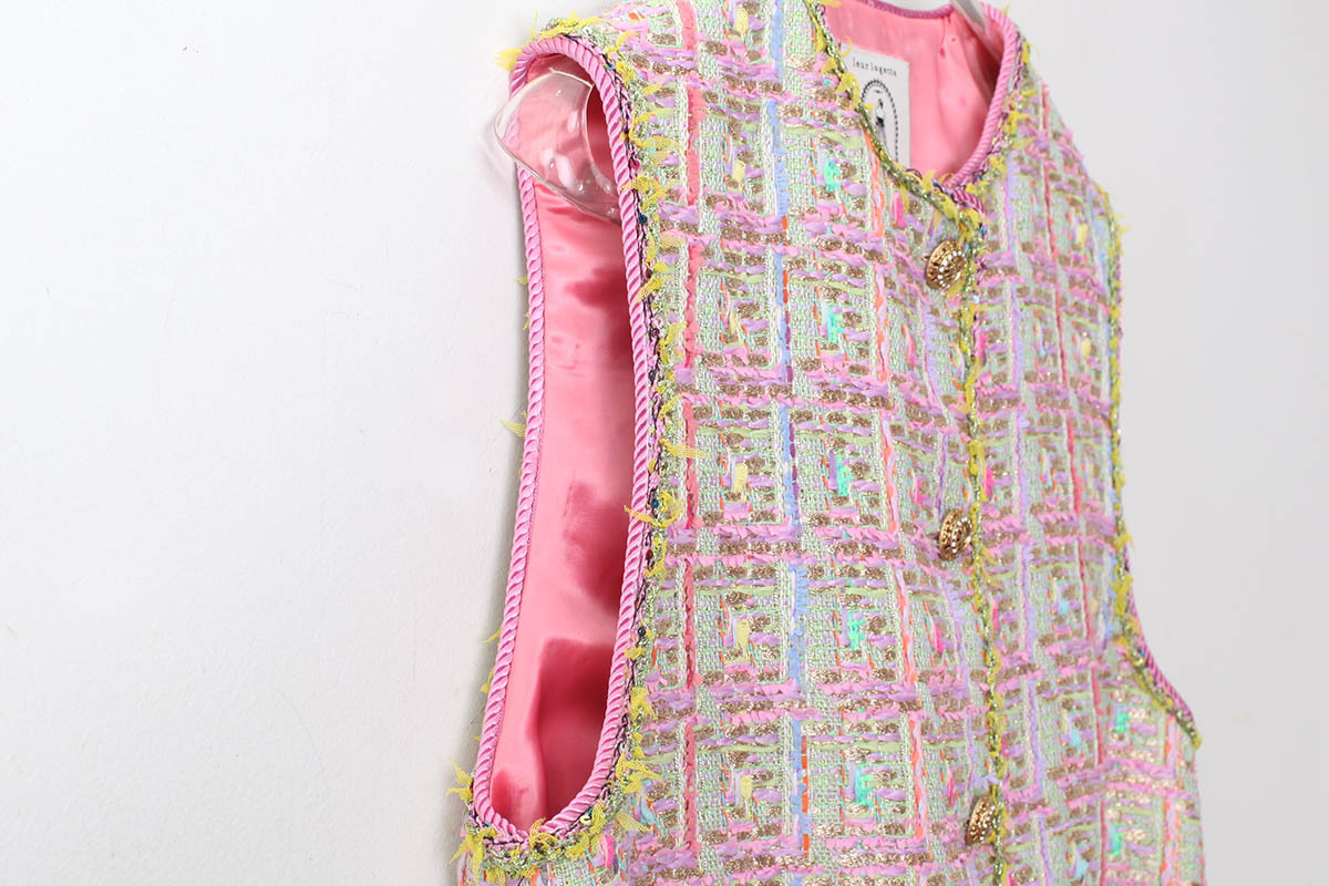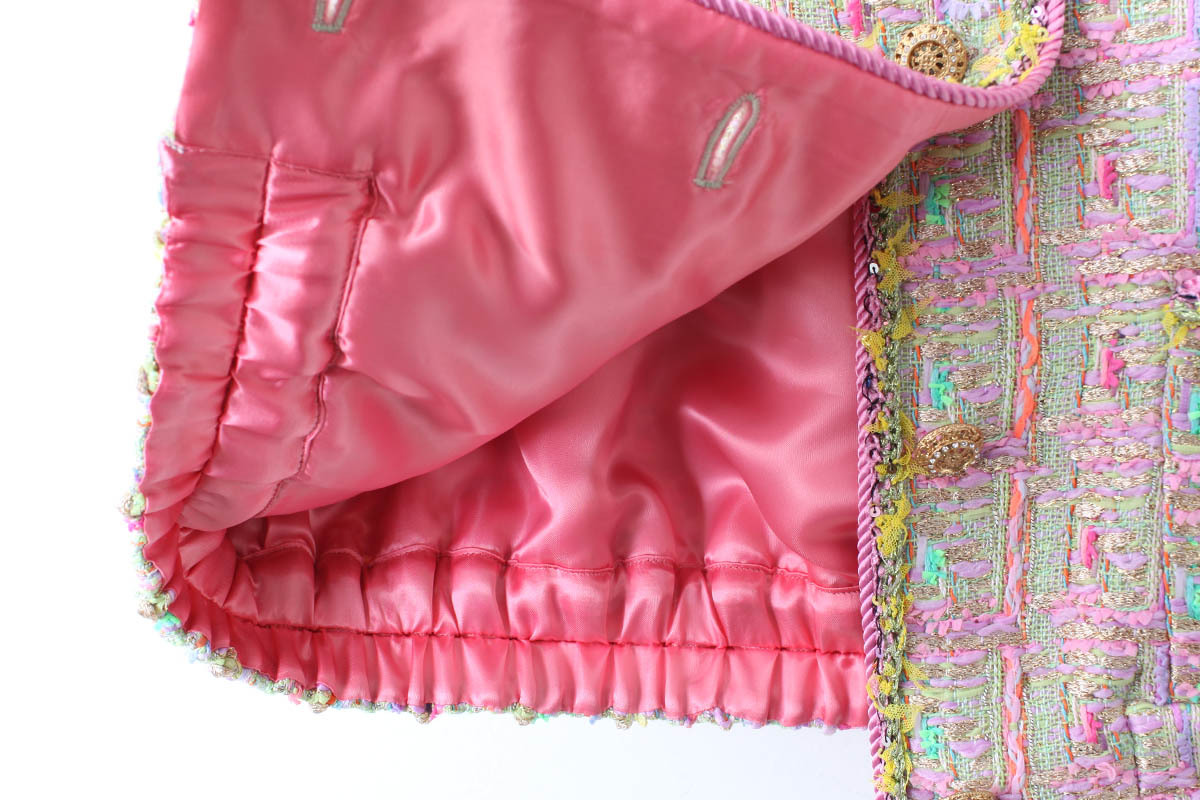 ピンクのブレードがツィードの華やかさを引き立て、フロントにはブランドオリジナルのビジューボタンが煌めきを添えています。