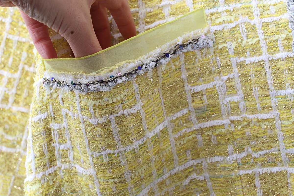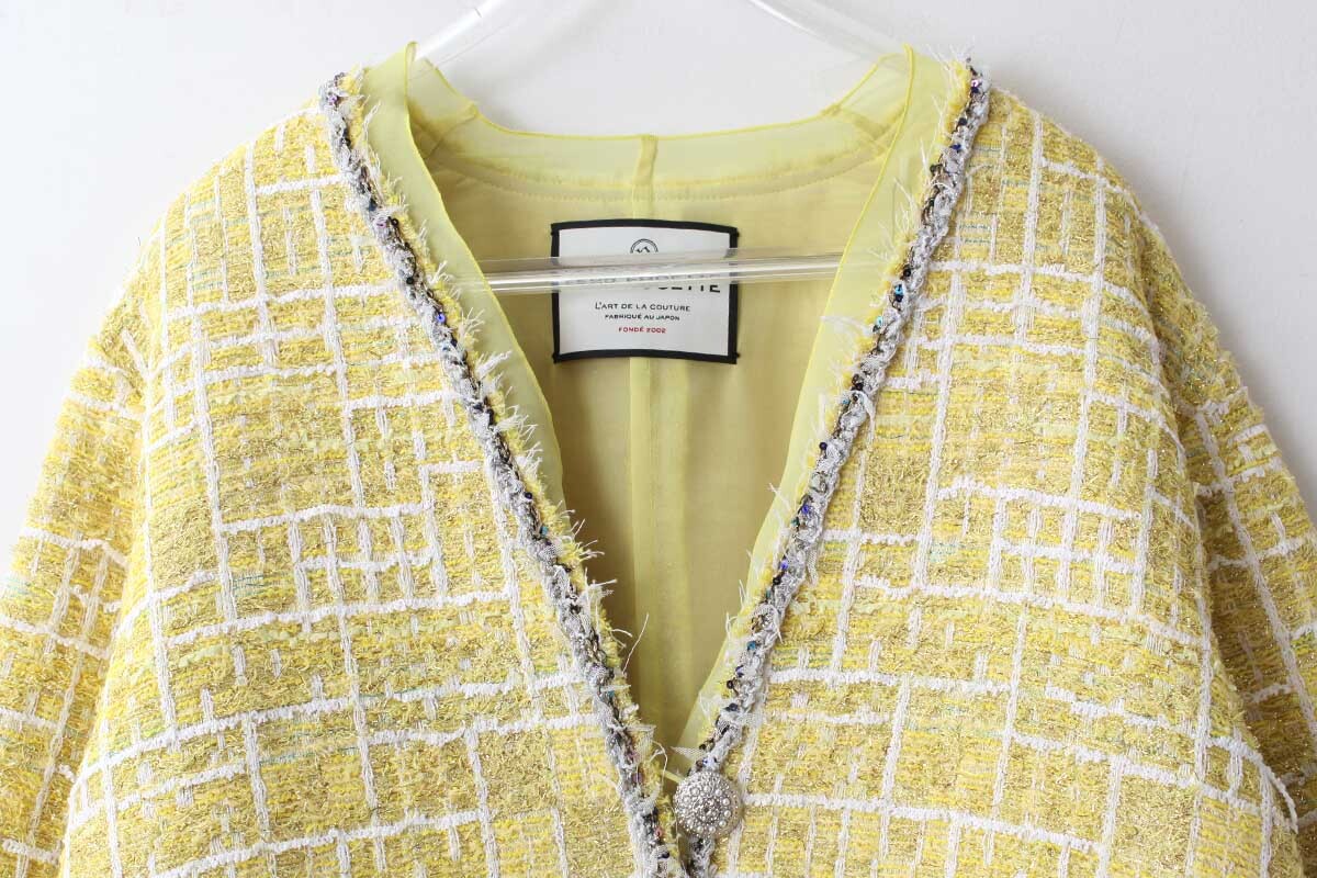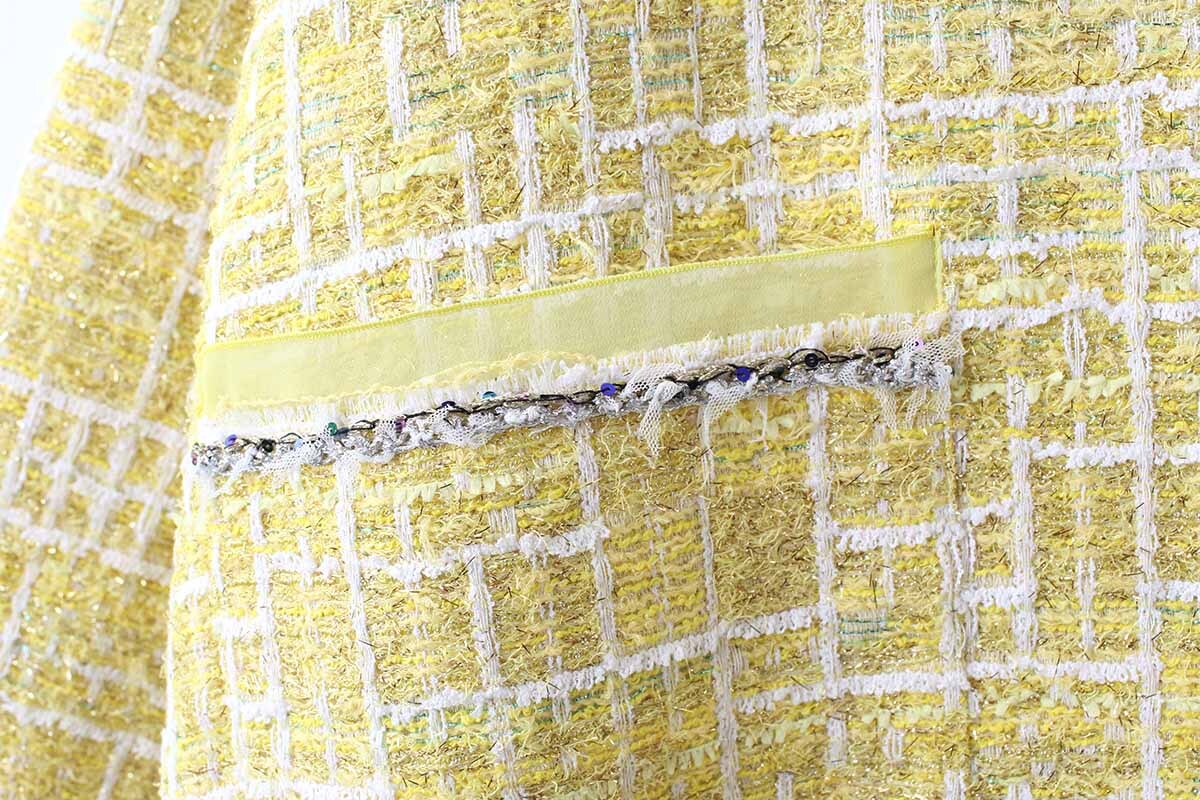 ペーパーヤーンやリリヤンなど、色とりどりの数種類の糸が織り込まれた自由で豊かな表情を持つCHANELツィードでお馴染みの、フランス・MALHIA KENT社のツィードでつくられたジャケット。