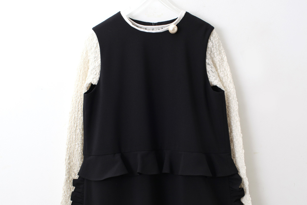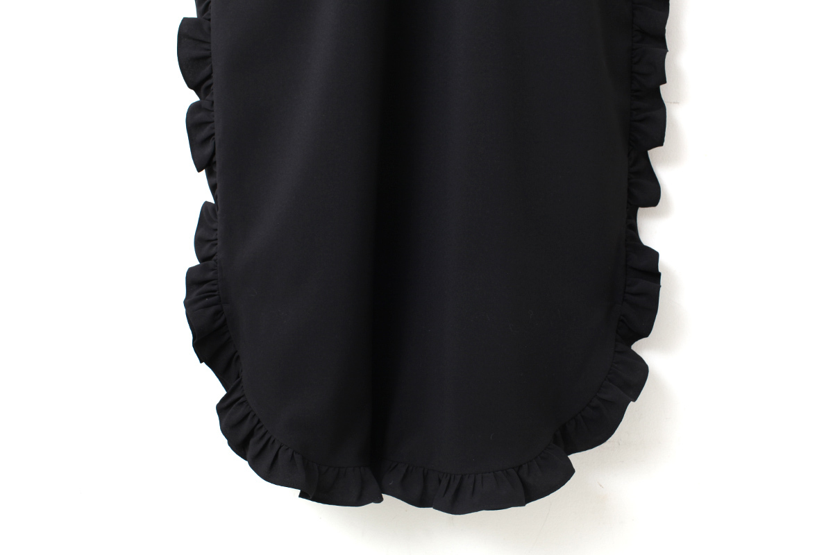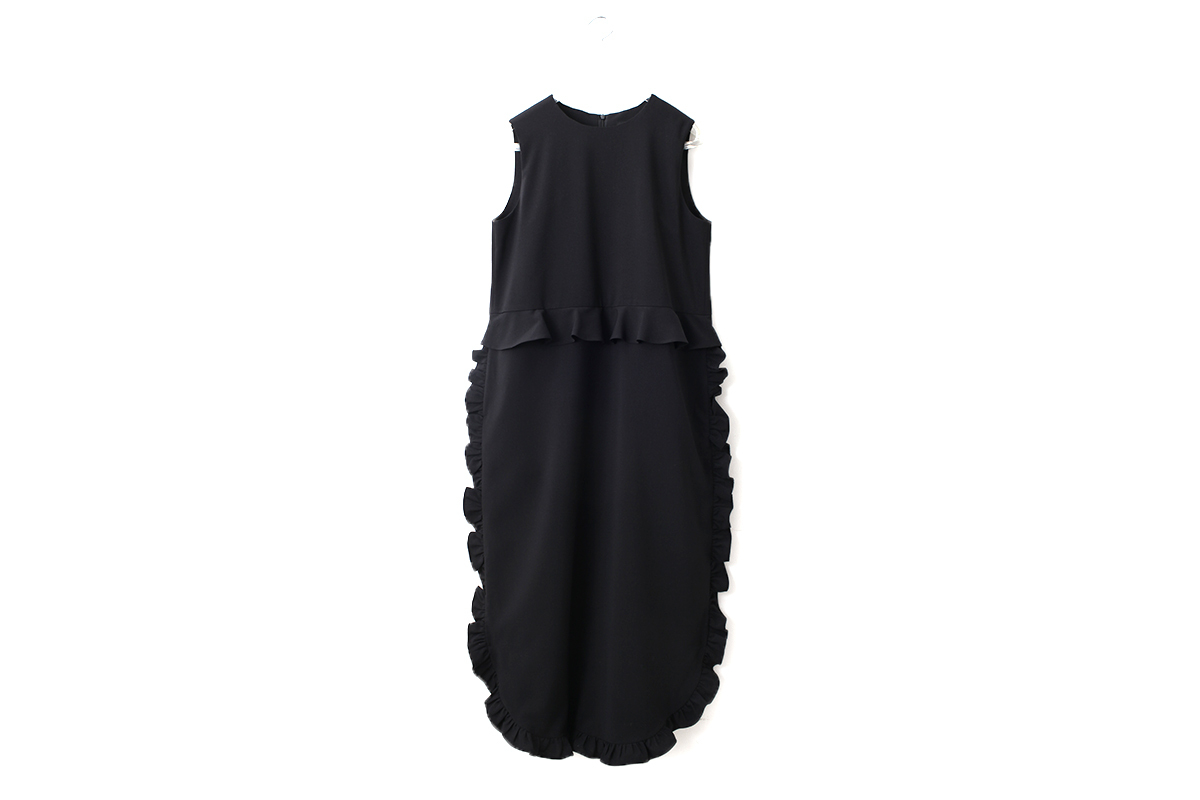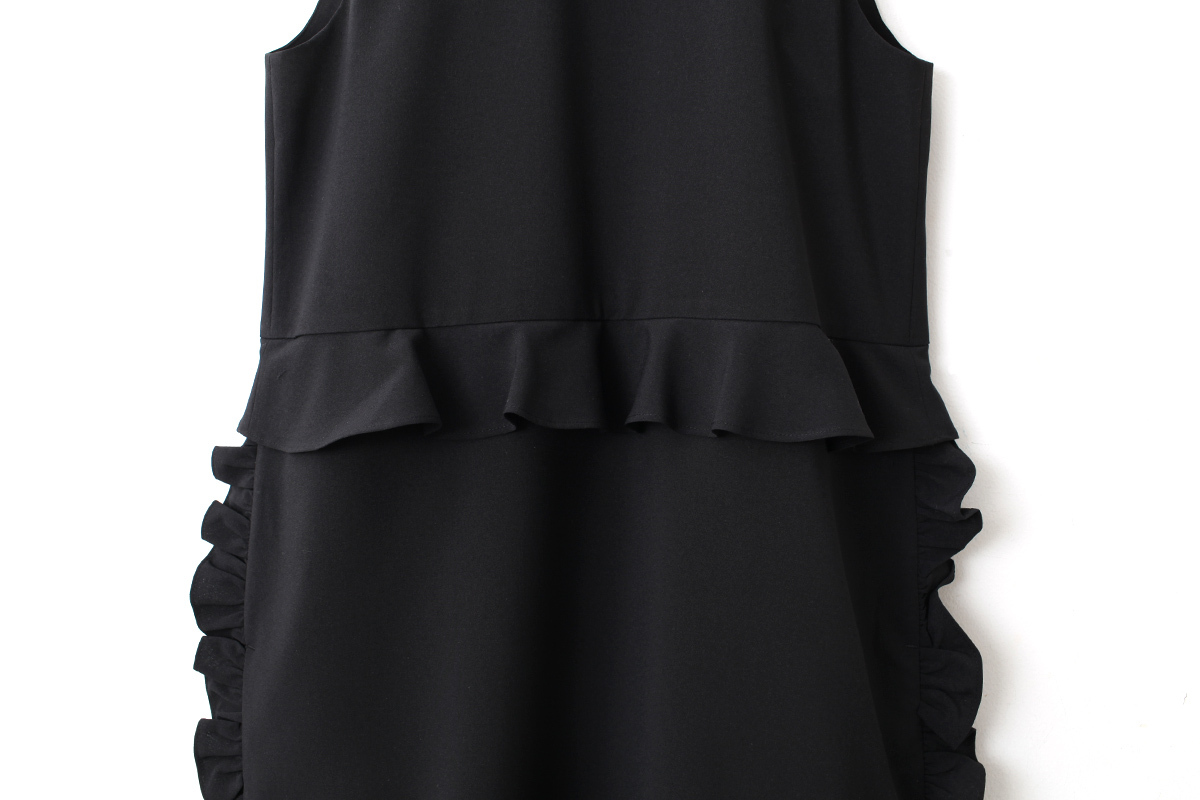 貝がらのような裾のフリルと腰のペプラムがポイントのワンピース。