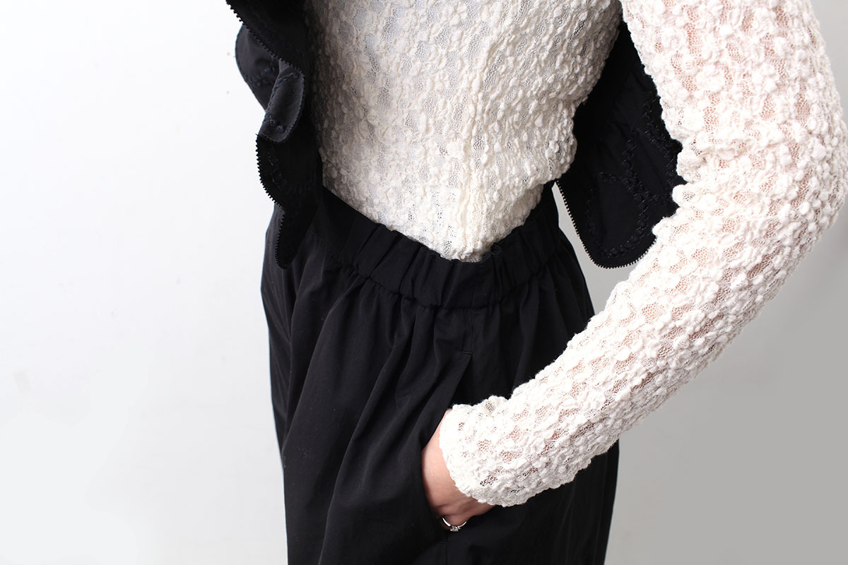 | 商品説明 | 小さな粒の連なりで表現された“tambourine(タンバリン)”。人の手の跡を消さないように表現した不揃いの粒は、不完全なものの美しさや、それぞれの個性をあらわしています。細番手のコットン糸を贅沢に使い、経糸は強撚、緯糸は引き揃えで高密度に織り上げられたサロペットは、刺繍のモチーフをレースのように配した繊細なデザイン。穏やかな艶とやわらかな質感で、動きに合わせて豊かな表情を見せてくれる一着です。 |