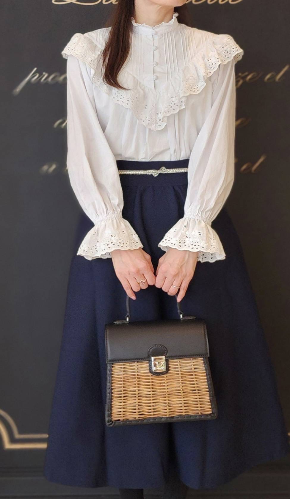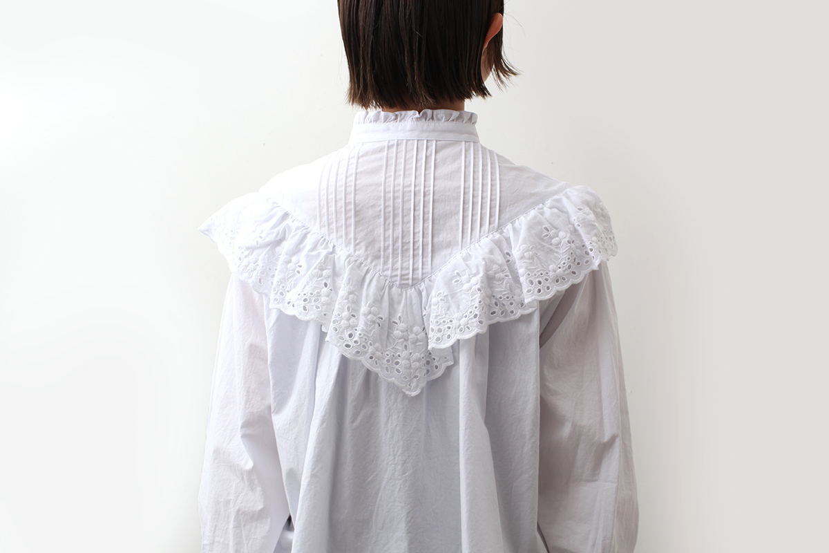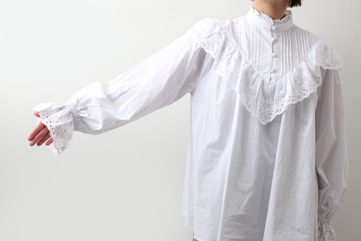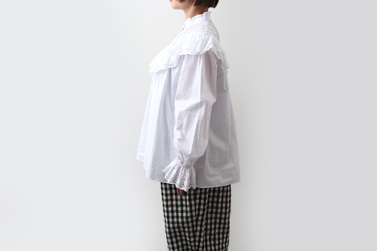 ショップ別注でレースのブラウスをお作りしました。首元はシンプルなスタンドカラーで、肩から胸元にかけてたっぷりとあしらわれたレースがキャズエドゥミらしい一枚。プルオーバータイプですので、1枚でさらりとデニムやワークパンツに合わせたり、オーバーオールやサロペットの下に重ねてもかわいいブラウスです。お袖にゴムが入っていますので、5分や7分などお好きな位置に袖丈を変えられるのも嬉しいポイントです。
