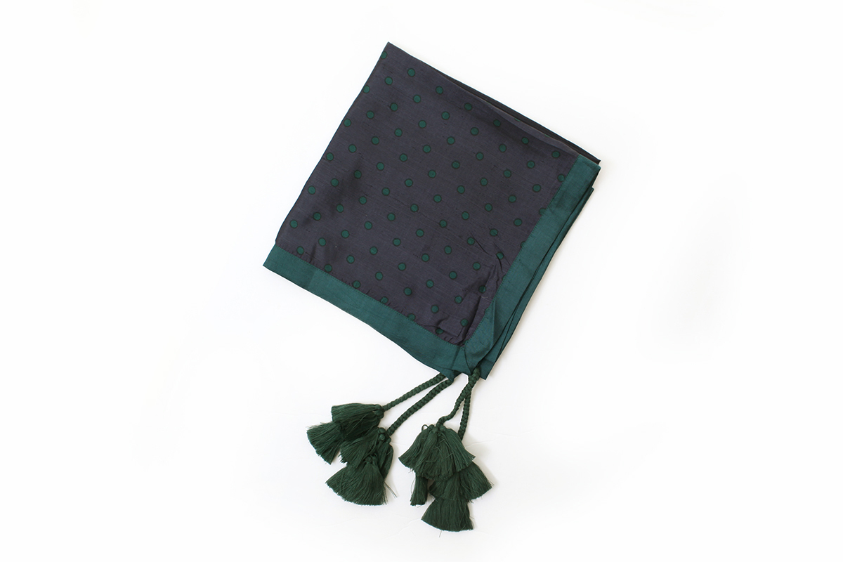 大判の正方形のスカーフです。絶妙な配色のドットプリント。四隅の角についたタッセルがポイント。