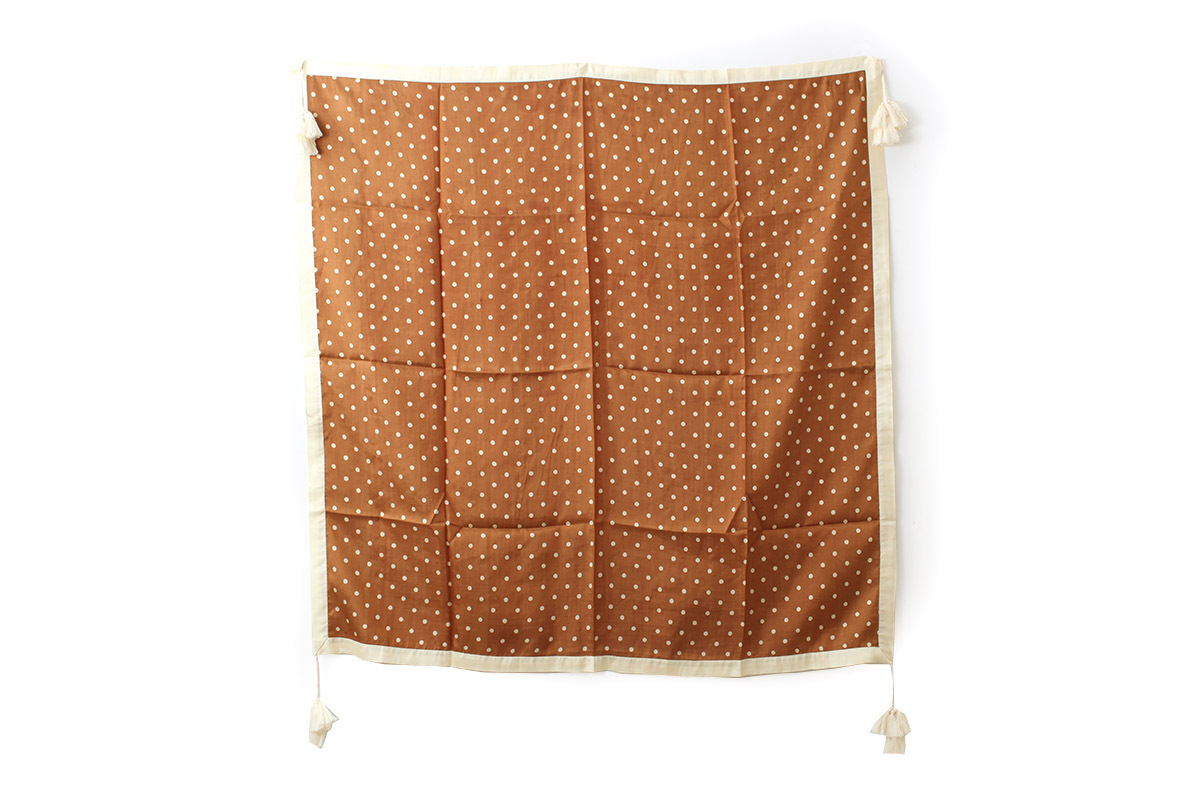 大判の正方形のスカーフです。絶妙な配色のドットプリント。四隅の角についたタッセルがポイント。