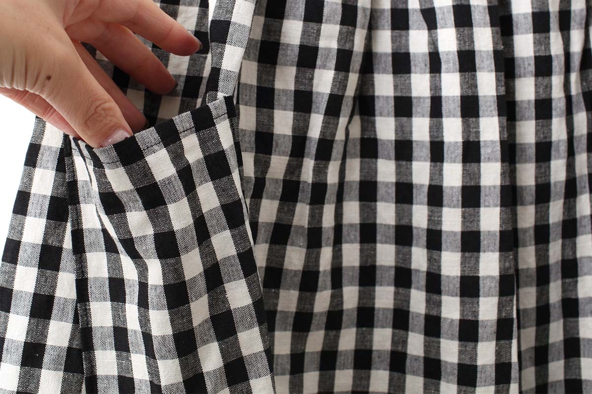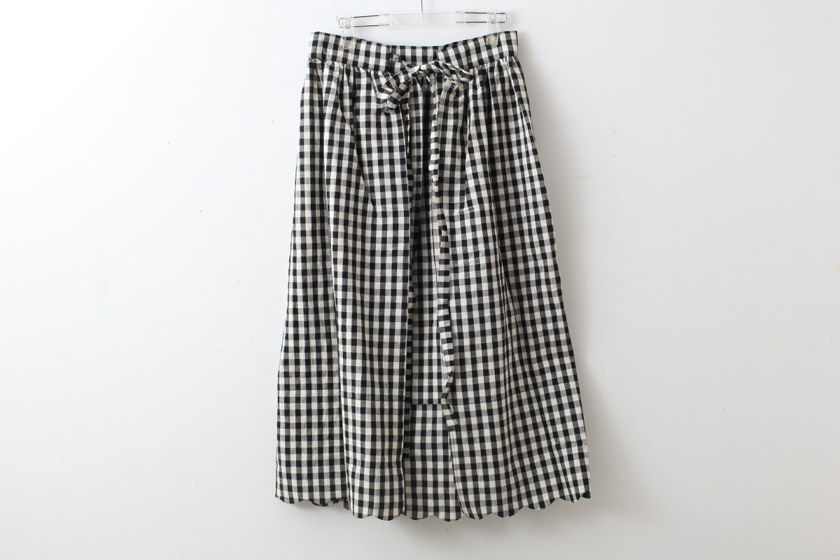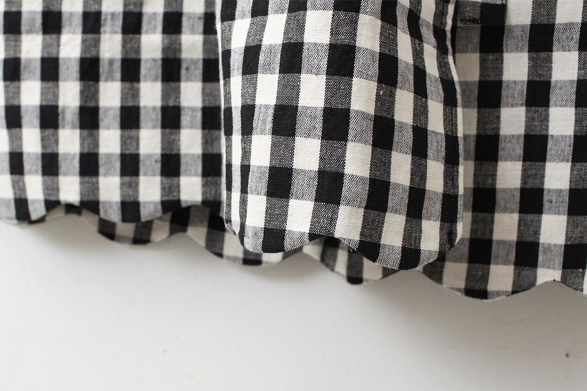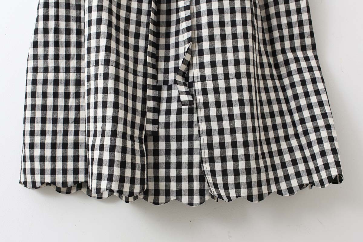 裾のスカラップがポイントのエプロンです。ワンピースに重ねたり、パンツに重ねたり、スカートに重ねたり、着こなし方は様々。意外とコーディネートに馴染むアイテムです。裾からちらりと見えるタグもかわいい。