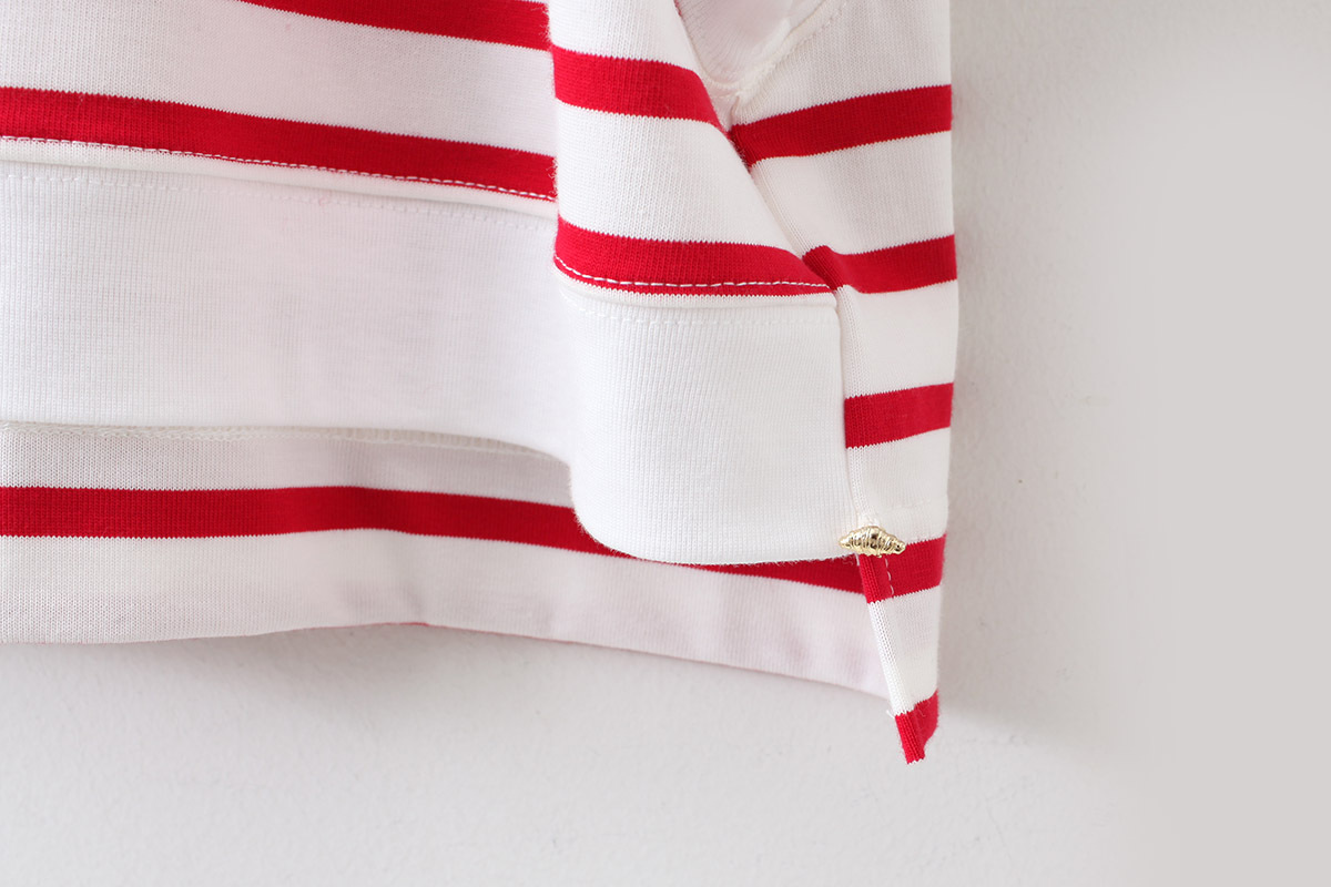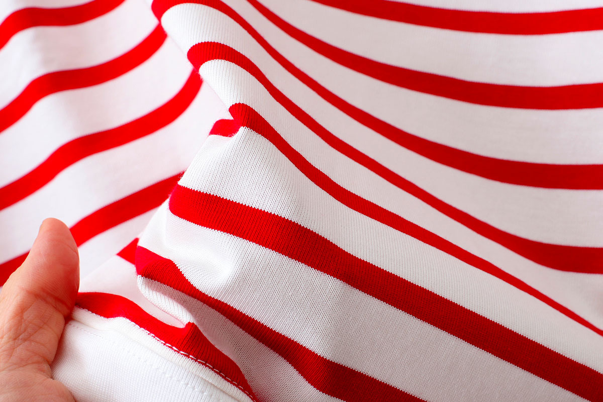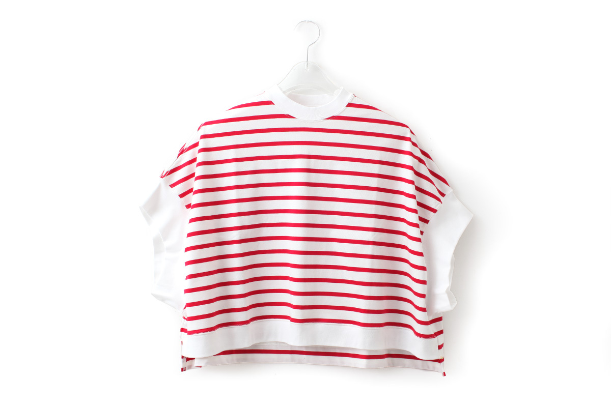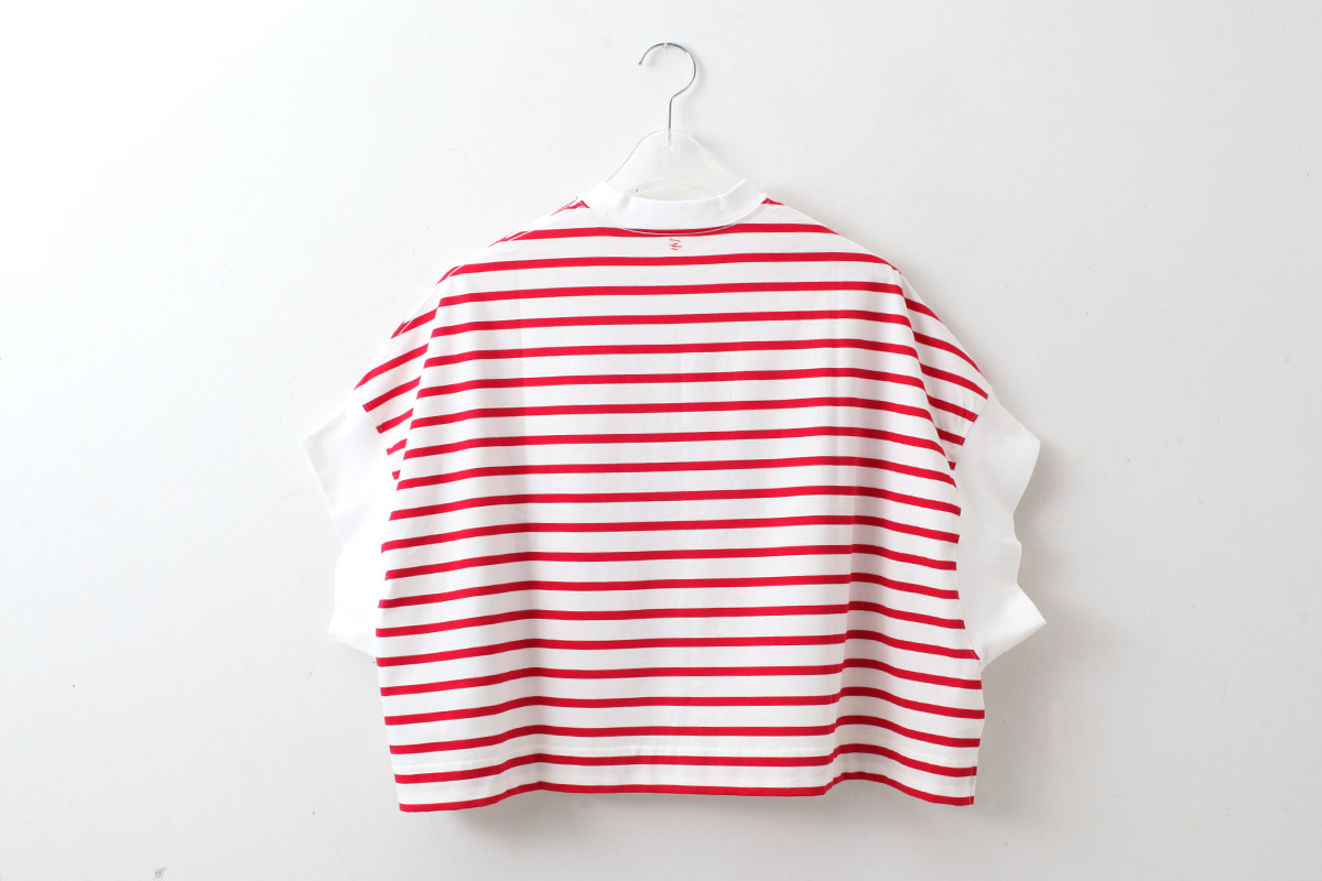 キメが細かく滑らかで毛羽が少なく光沢感があるのが特徴のジャージーで作られた、フレンチスリーブTシャツ。クルーネックの首元はできるだけタイトに仕上げられています。アームホールは大きく開いており、広巾のフライスが合わせてあります。襟がタイトで、袖、裾が緩い動きのあるコットンジャージーのシャツです。左の脇裾にテーマにちなんでのクロワッサンコインがついています。今シーズンは着丈が異なるMとLの2サイズ展開です。