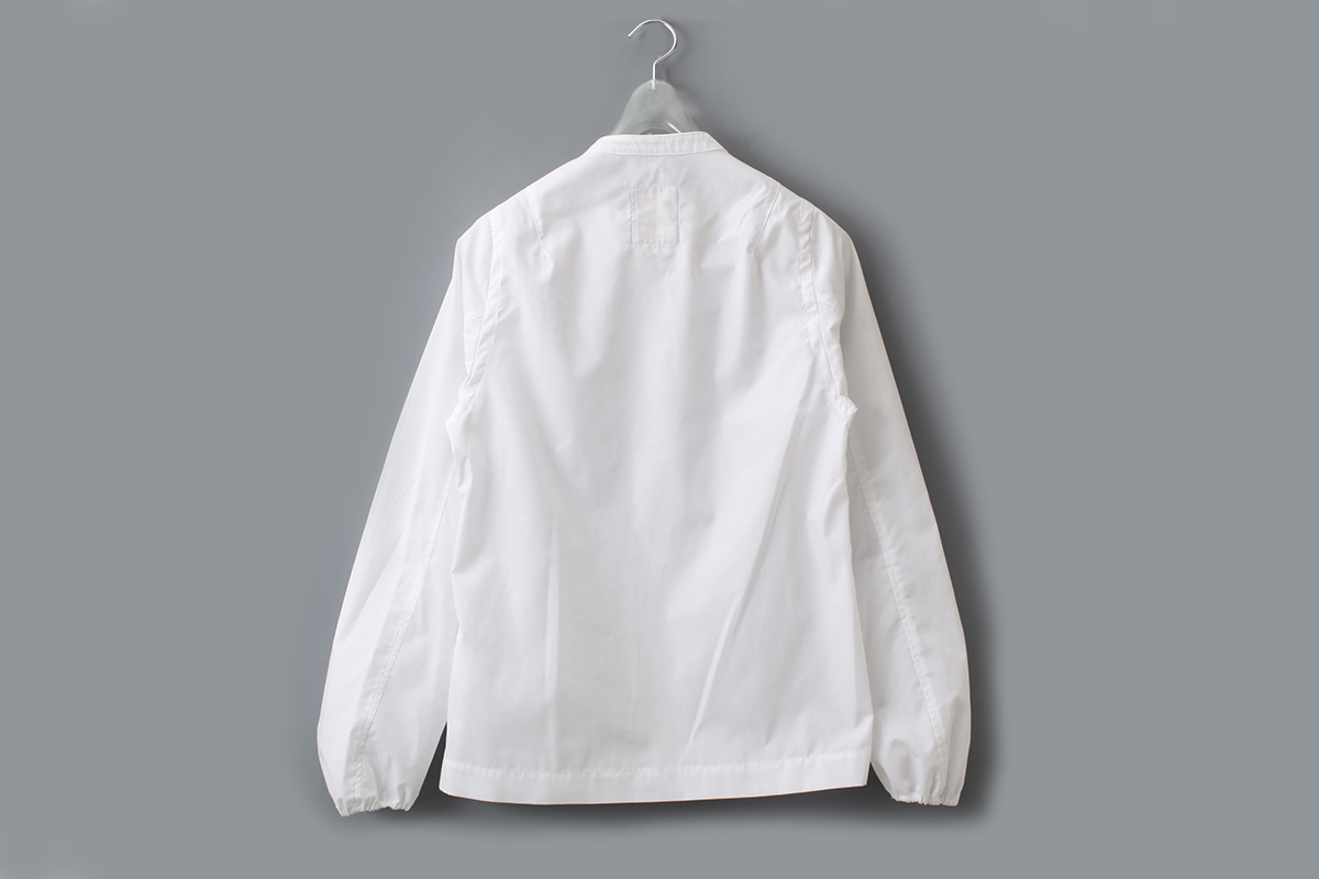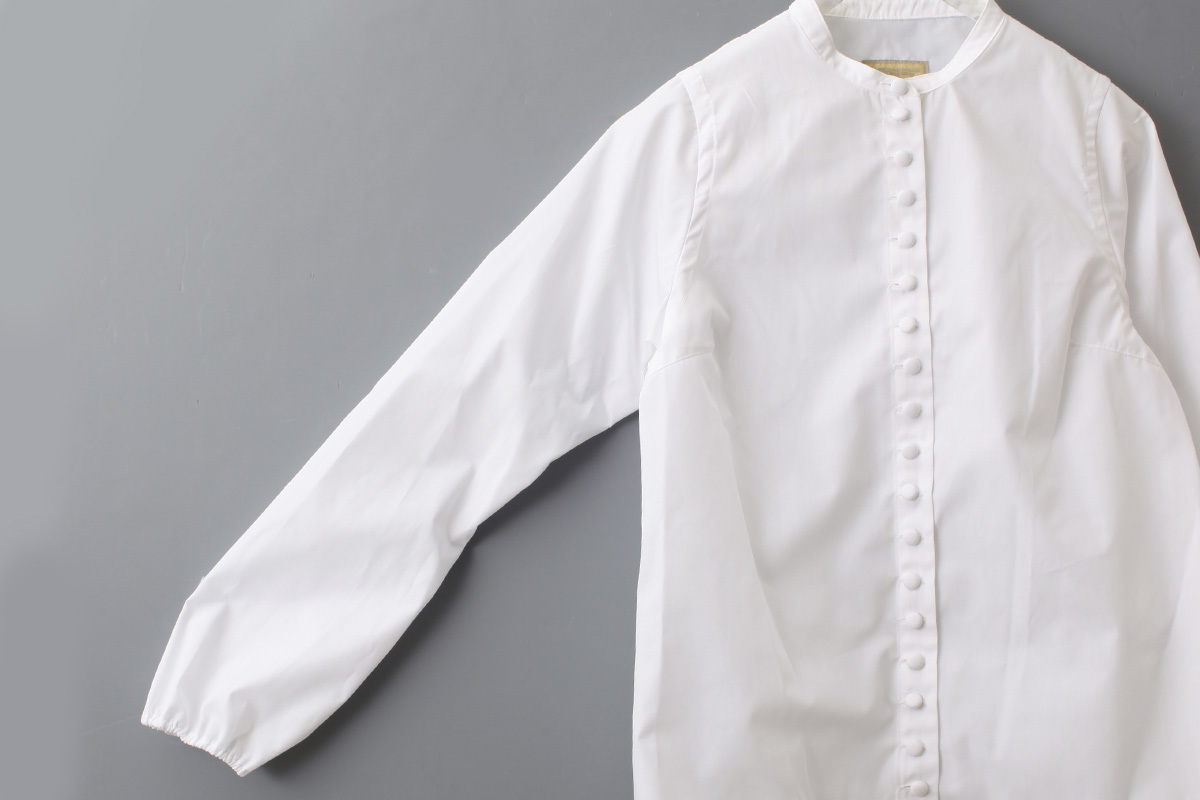 YAB-YUMの定番、小さなスタンドカラーにたくさん並んだくるみボタンが印象的なメニーボタンシャツをキャズエドゥミ別注でお作りいただきました。