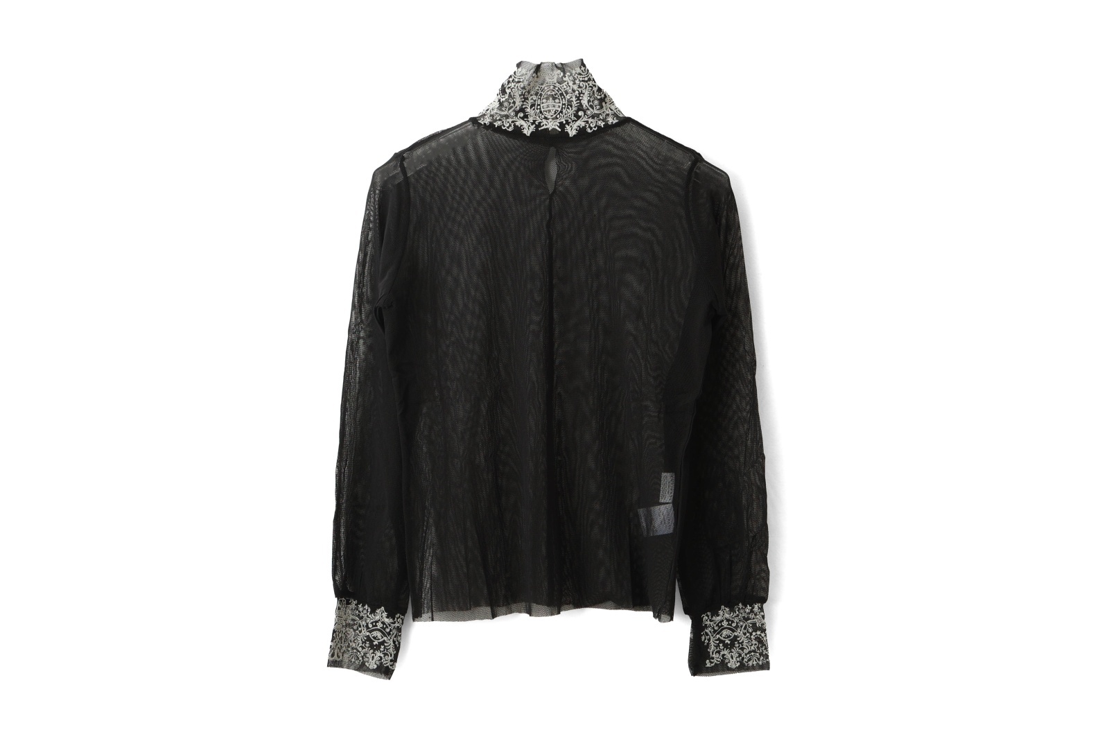| 商品説明 | メッシュ素材に袖口とネック部分にフロッキープリントが施されたカットソー。柔らかな肌触り。ワンピースやベストのインナーとしてお召し頂くと、抜け感が演出できます。タートルネックの後ろがボタン開き。 |