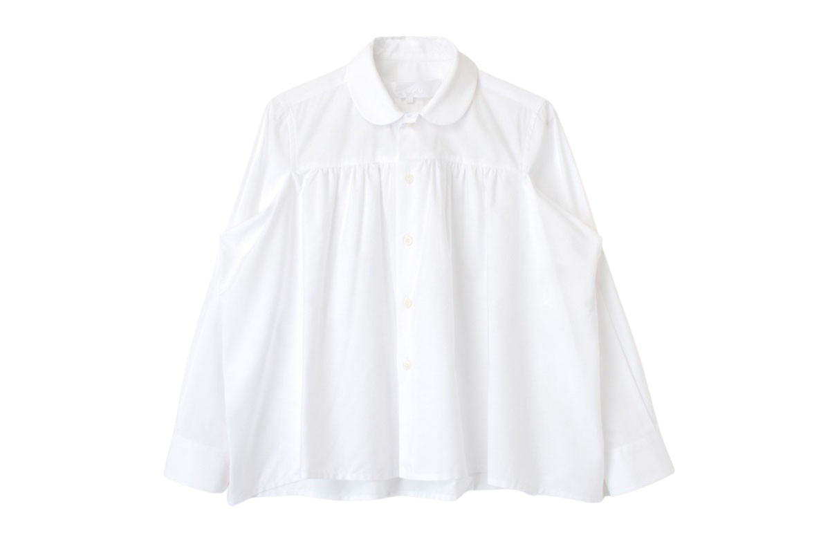肌触りの良い綿ブロードで仕立てたtao (tricot COMME des GARCONS)の定番ブラウス。前後にギャザーを施した分量感のあるふわりとしたフォルムが特徴です。襟は小さめの丸襟。フロントの着丈がやや短く軽やかな印象に。