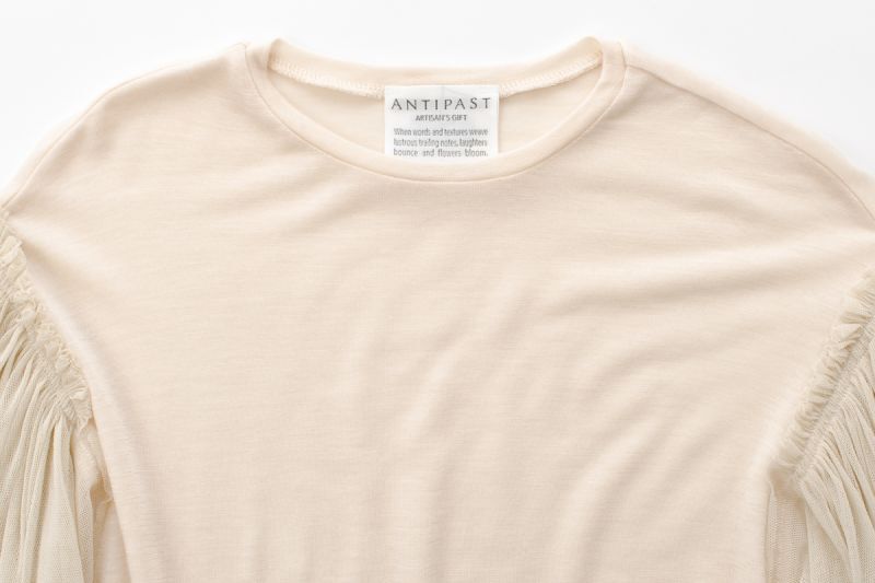 柔らかなチュールが重なった袖が特徴的なカットソー。ウールの柔らかでさらりとした生地感。バックの羽モチーフがポイントに。デニムとやシンプルなボトムとのコーディネートやノースリーブワンピースのレイヤードとしてもおすすめです。