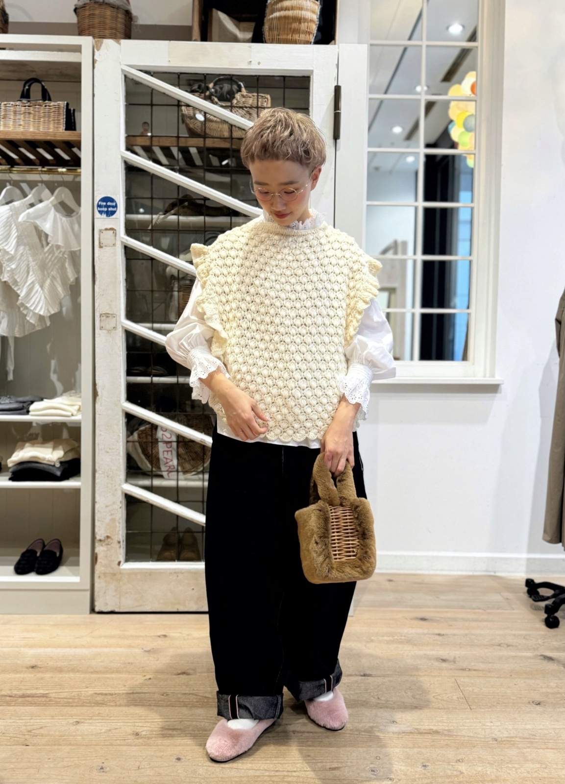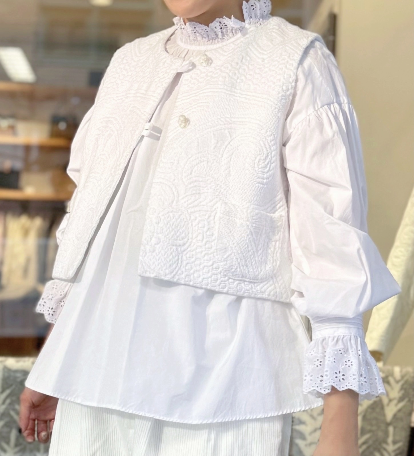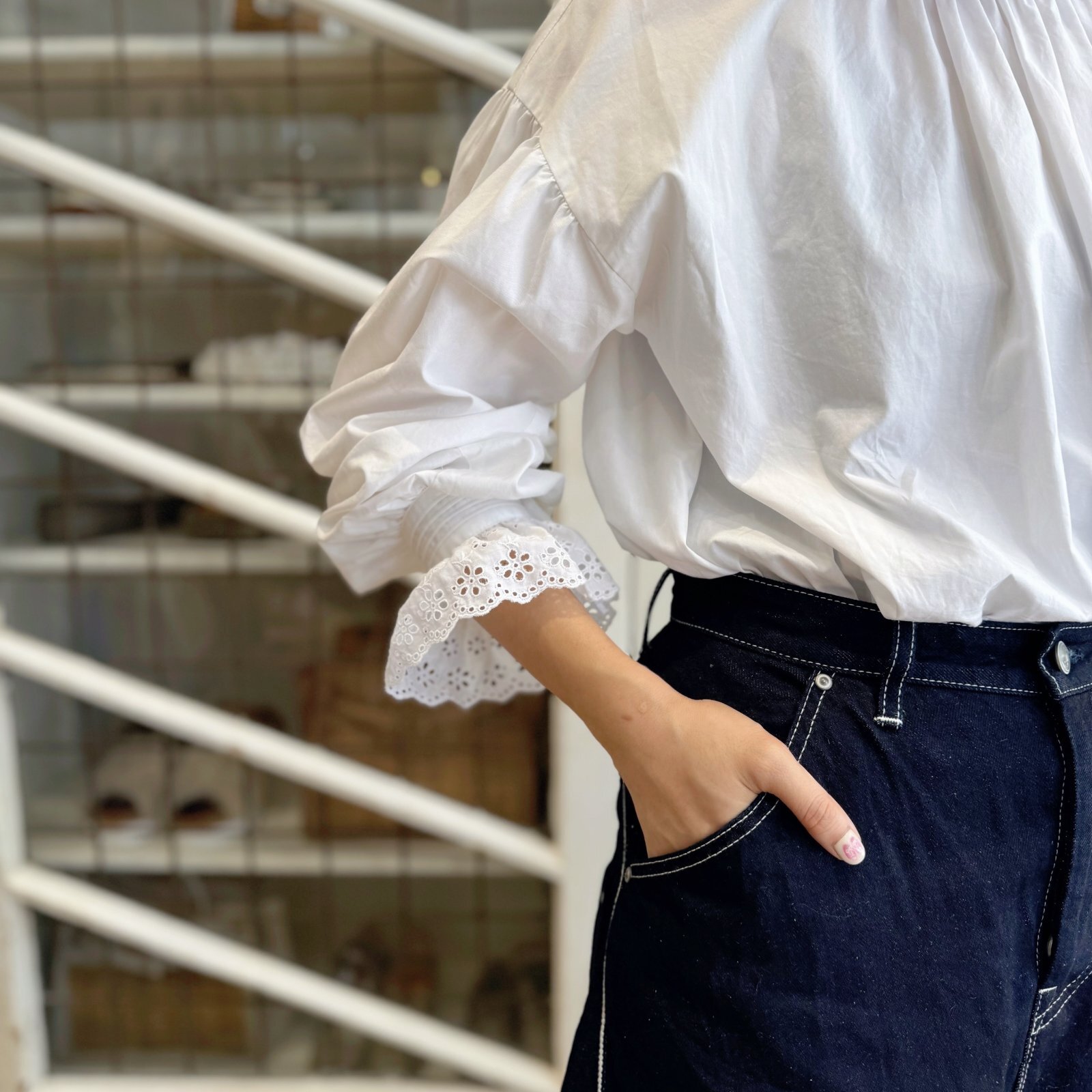 ショップ別注でレースのブラウスをお作りしました。レース衿をスタンドカラーに仕立てました。肩にボタンが付いているので着脱がしやすくなっています。 プルオーバータイプですので、1枚でさらりとデニムやワークパンツに合わせたり、ニットやワンピースの下に重ねて襟や袖のレースをチラ見せしてもかわいい。薄手のコットン素材ですので1年を通してご着用頂けます。