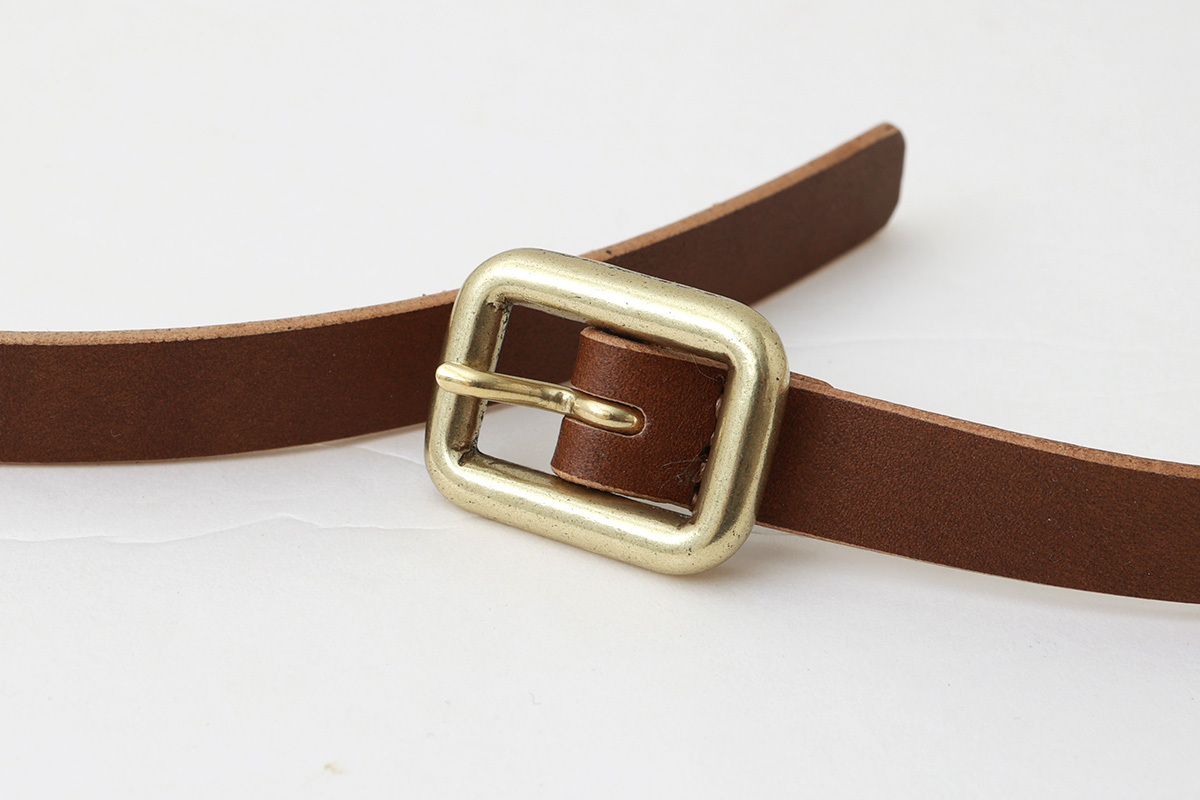 本革の細めのベルトにオリジナルのメタルのバックルで