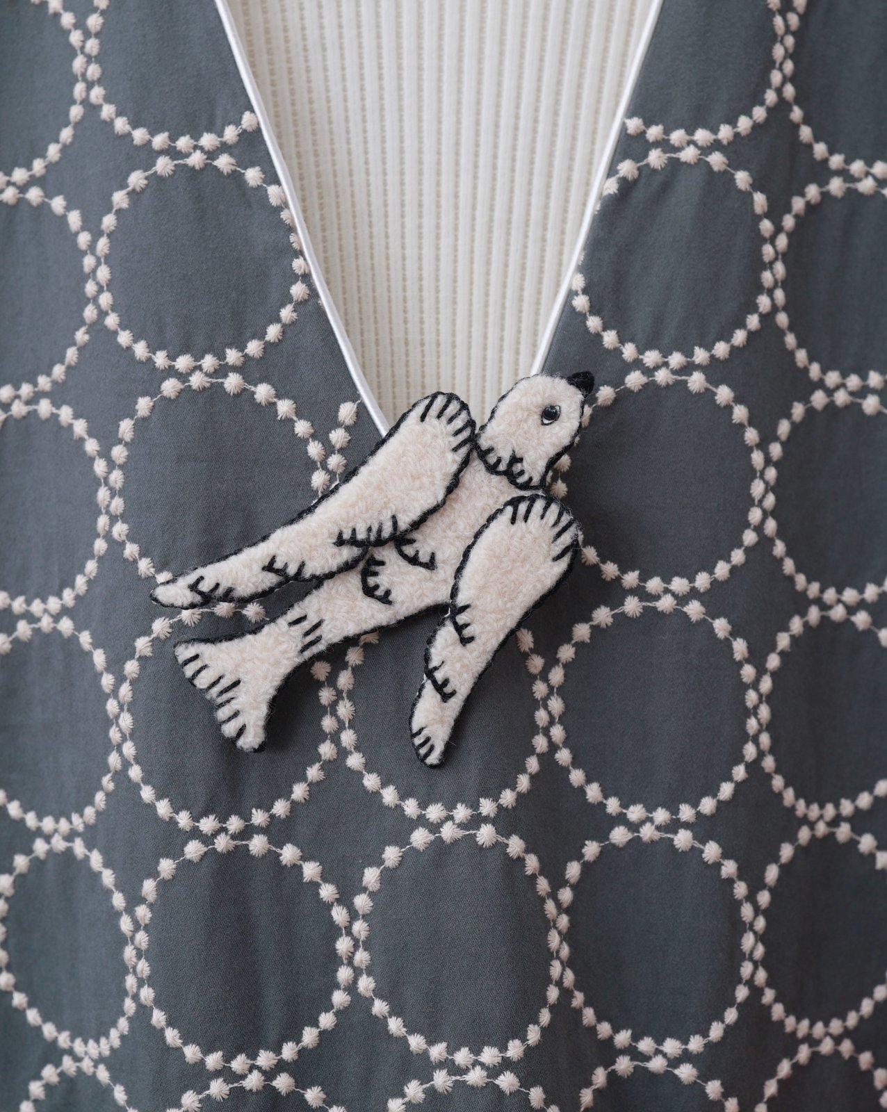 商品説明 | 雪の中を縫うように飛ぶ鳥たちを描いた“wind bird(ウィンド バード)”の鳥を象ったコサージュ。オーストラリア産ラムウールを使用したボアの生地に手刺繍で鳥の模様を描かれています。ふわふわとした羽毛の質感を感じられるような、クラフト感漂う一品です。 |