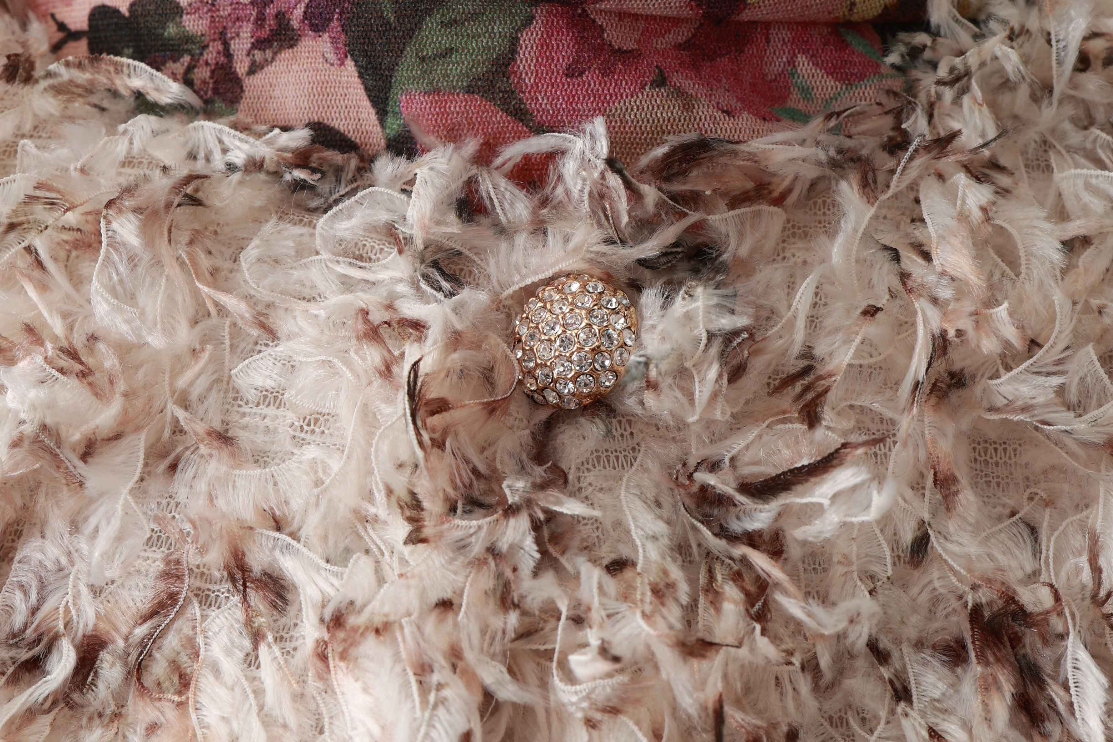 やわらかなファンシーヤーンが使用されたストレッチ性のあるカットジャカードに抽象的なプリントが施されています。