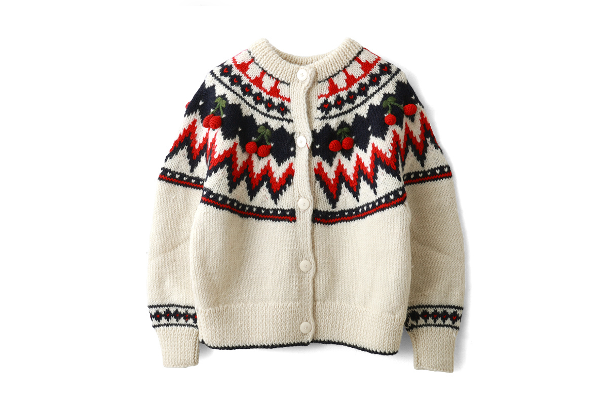 チェリーモチーフが目を引くどこかノスタルジックな雰囲気漂うニットカーディガン。