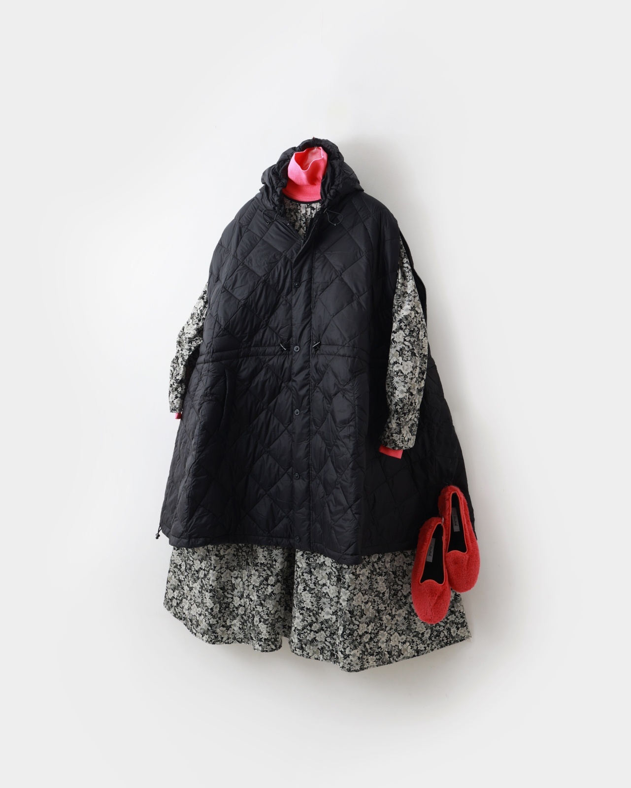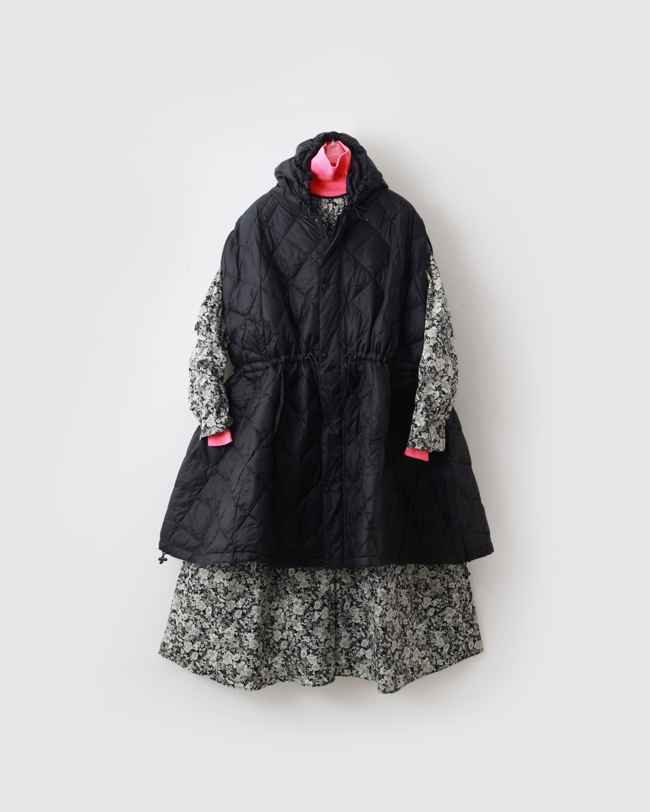 脇のファスナー開閉やウエストのドローコードを調整すれば、気分やコーディネートに合わせてシルエットを自在にアレンジ可能。