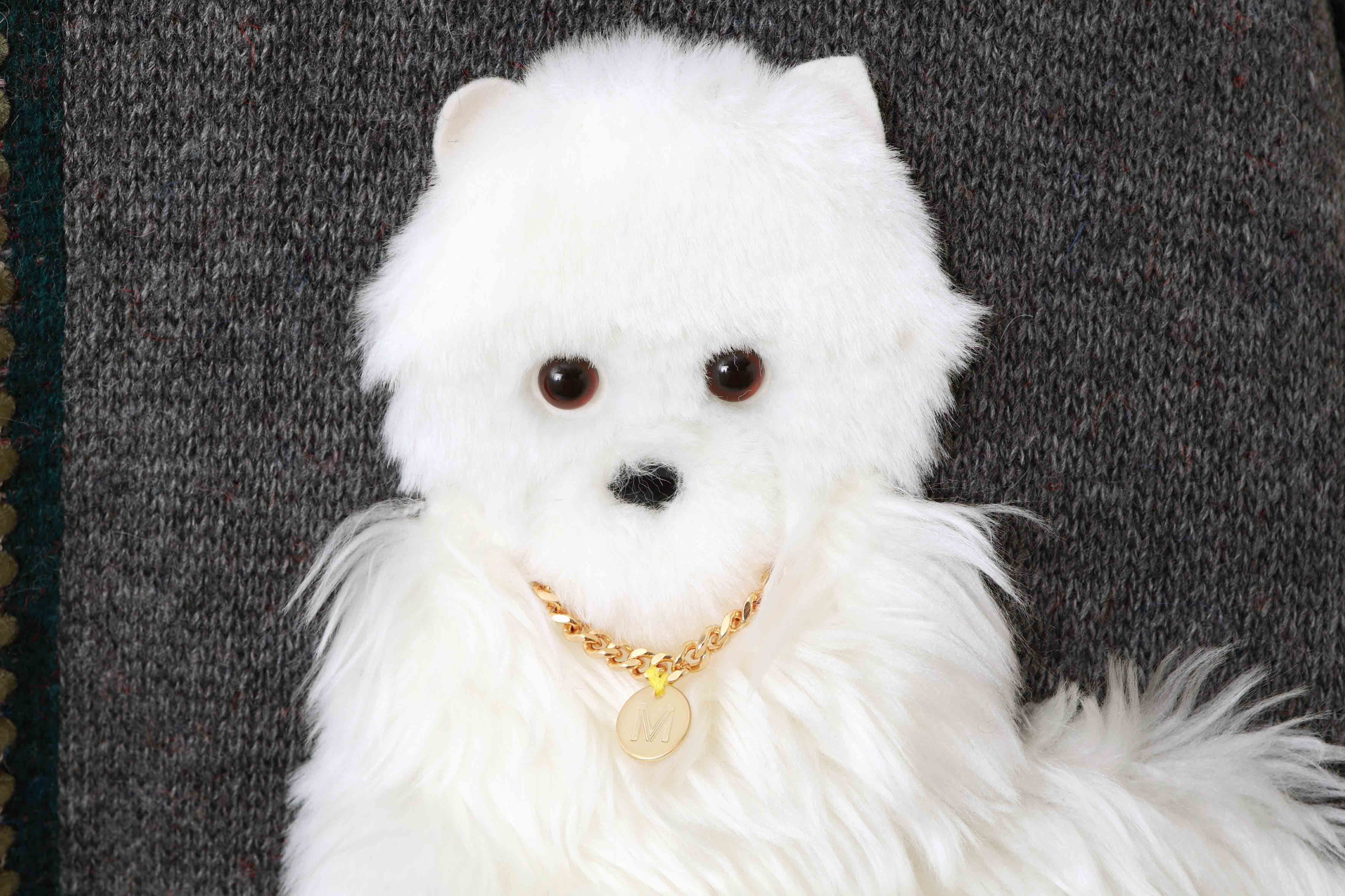 お散歩するイヌのモチーフをニットで表現されたジップカーディガン。フロント部分にはブドウ、バック部分にはイヌのお散歩風景がデザインされています。ビーズやファーアップリケを手刺繍して表情豊かに仕上げられています。