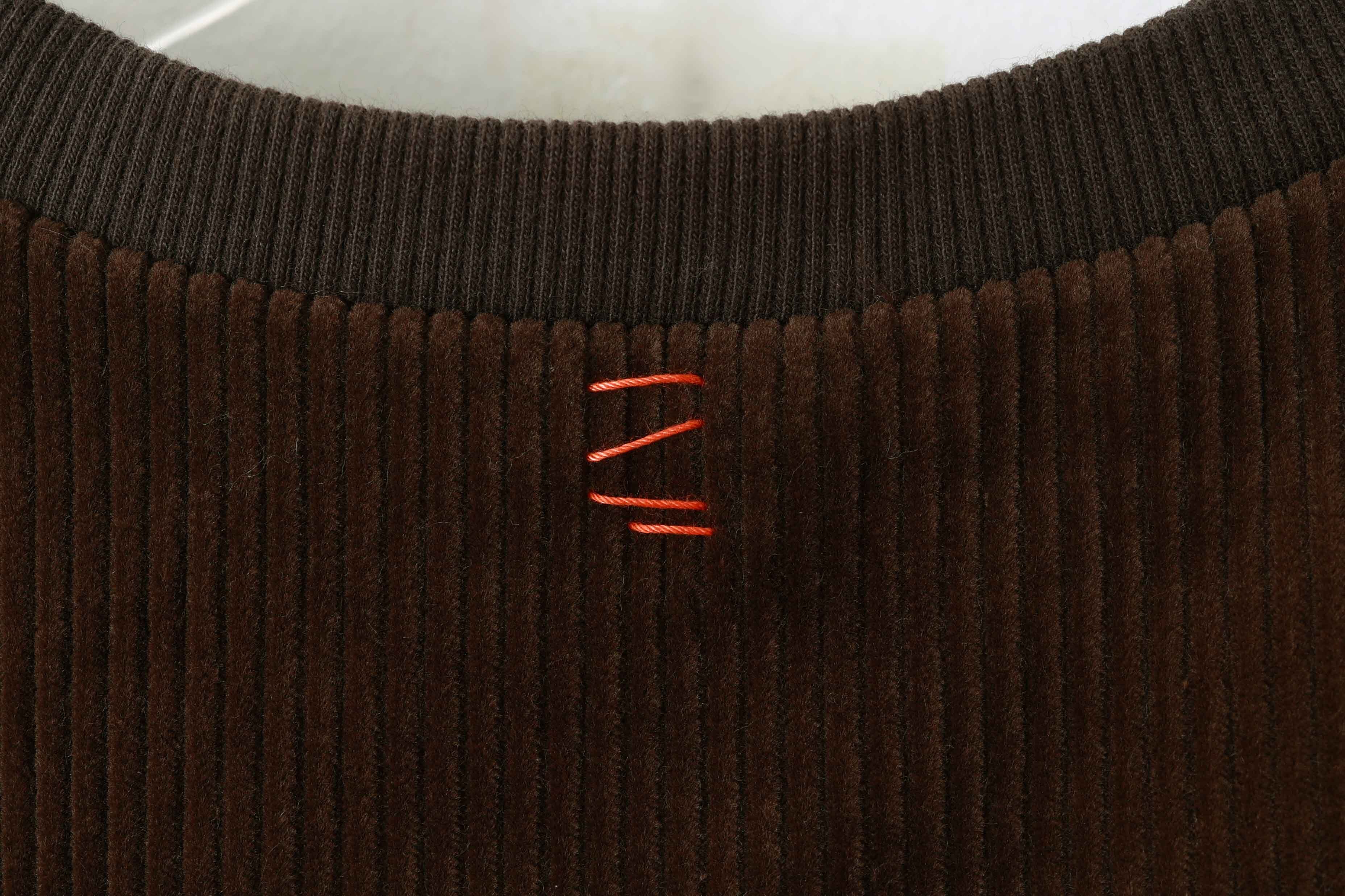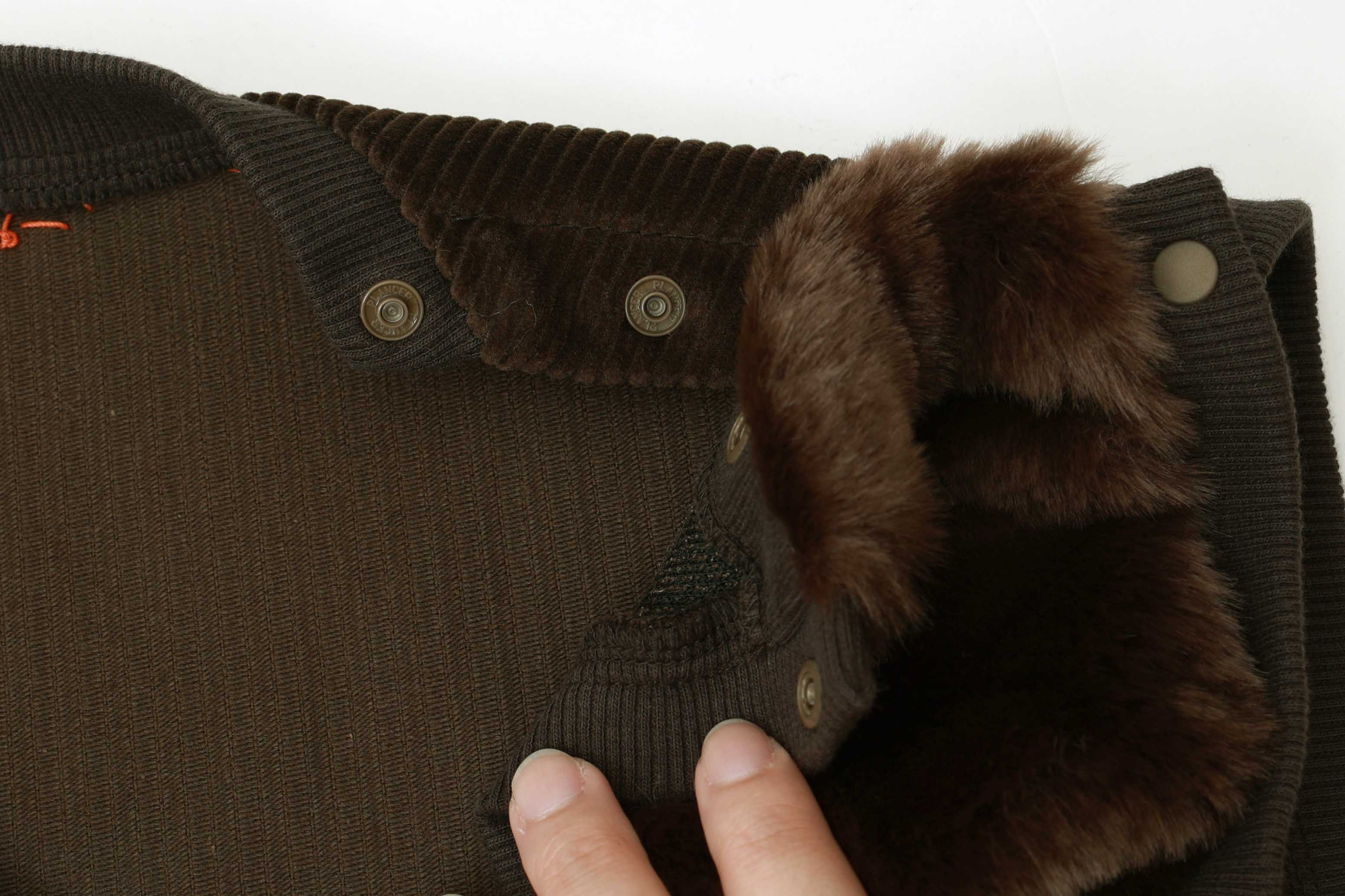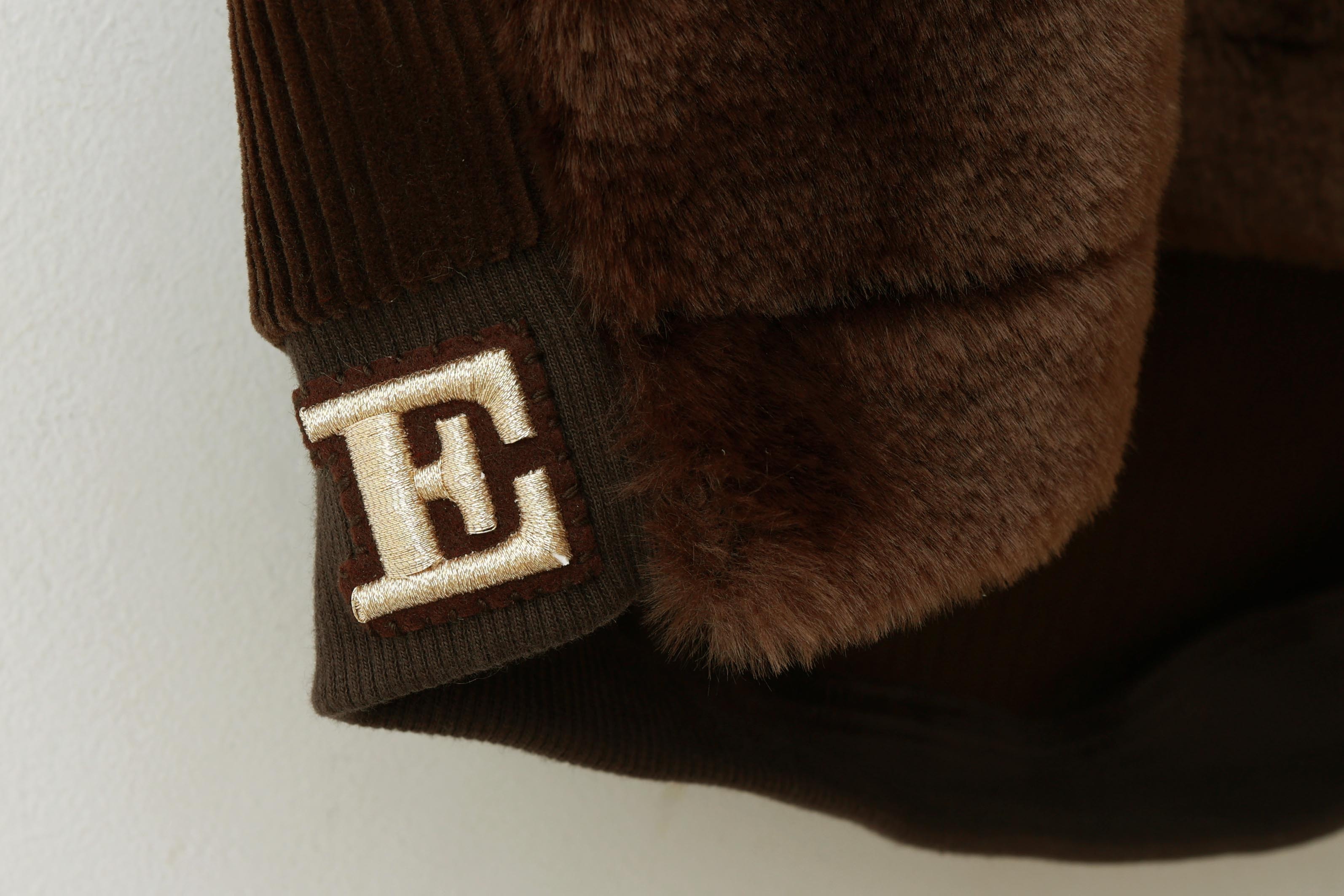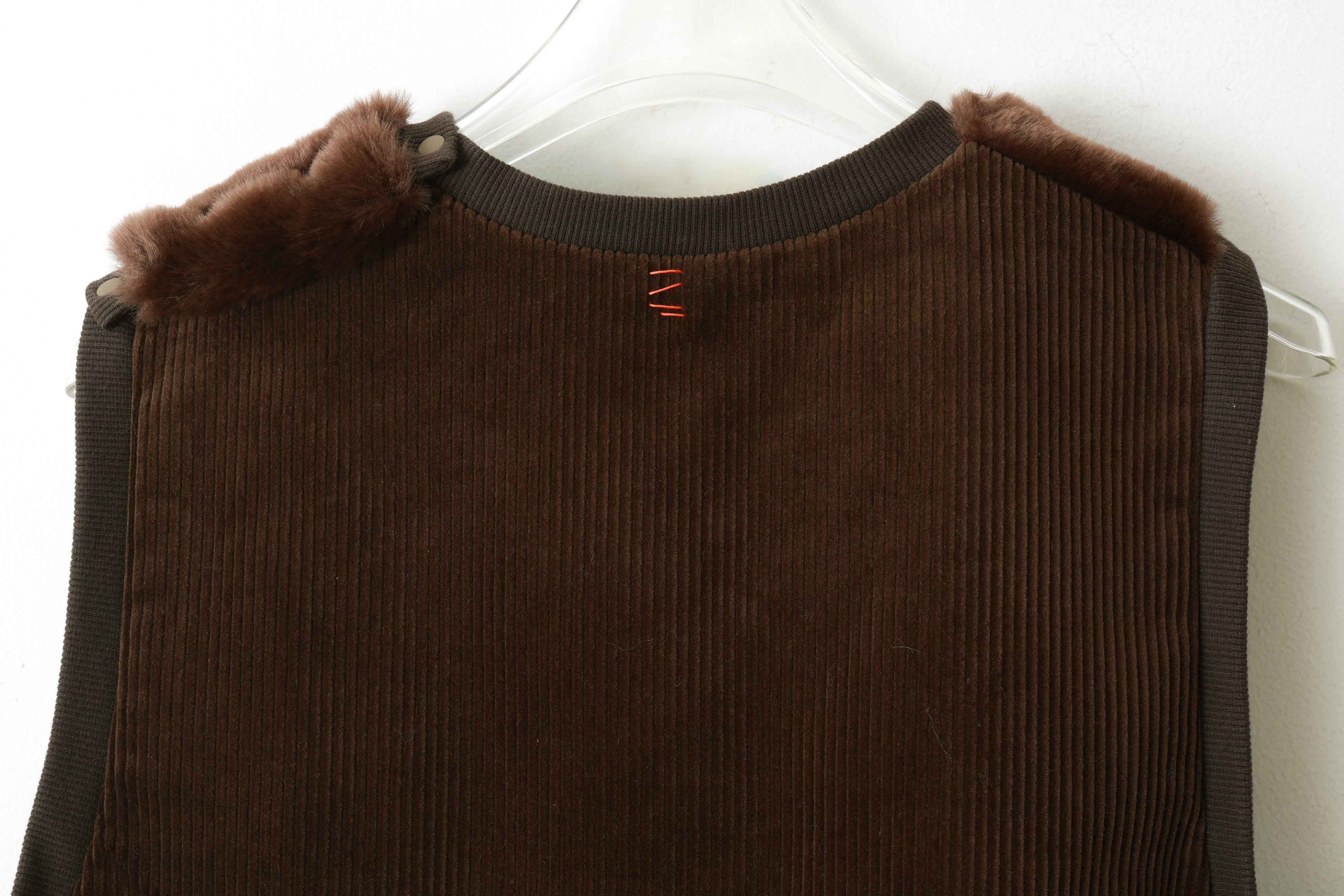 | 商品説明 | エコファーとコーデュロイの組み合わせのベスト。浅めにデザインされたV襟と丸みのある後ろの裾がポイントです。裾リブに「E」の刺繍ワッペンが付いています。左肩には肩ホックが付いており、脱ぎ着がしやすい仕様となっております。 |