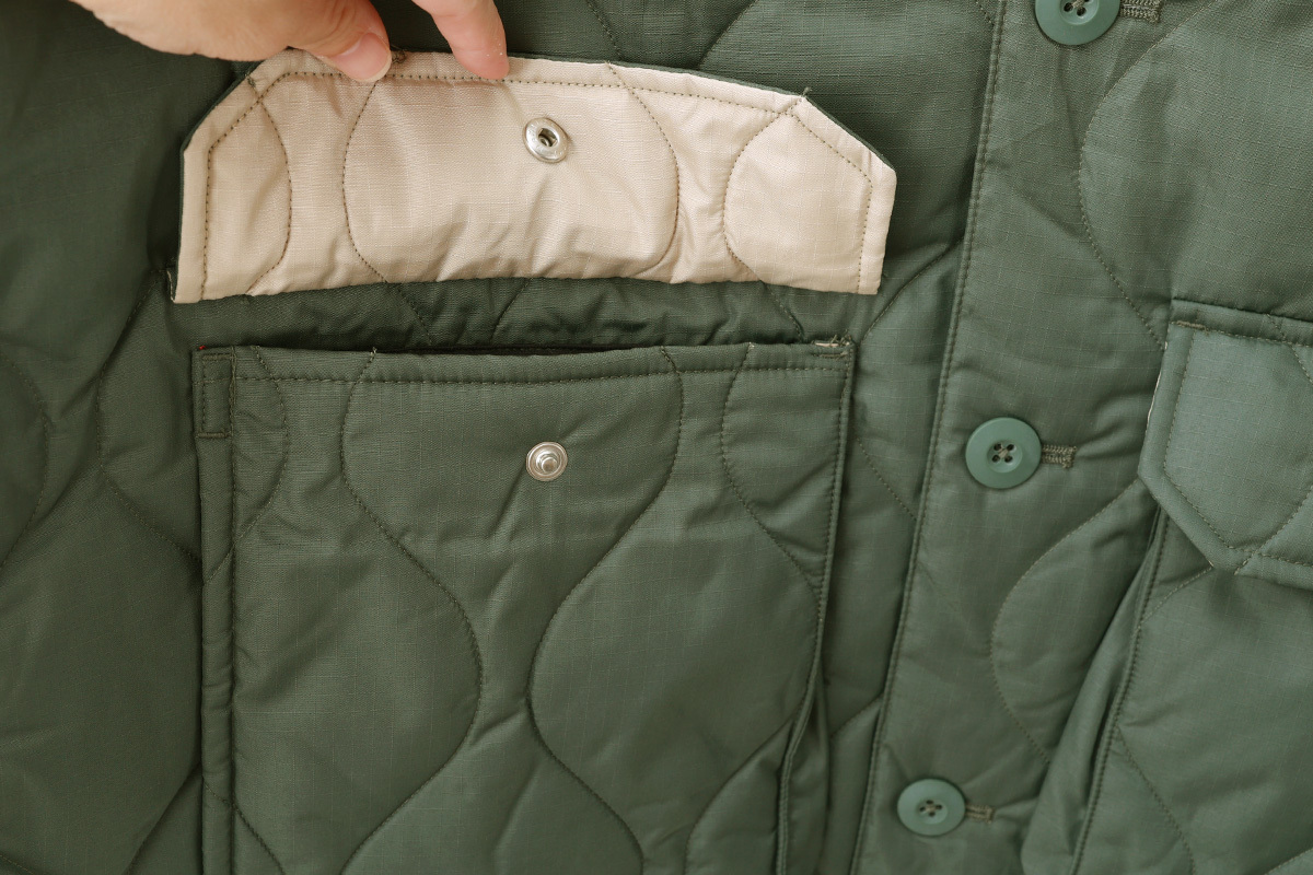 左右の腰ポケットは2WAY仕様になっていて、タテから入れるフラップ付きポケット、ヨコから入れる内側がフリースになったハンドウォーマーポケットになっています。