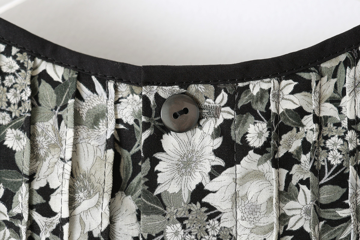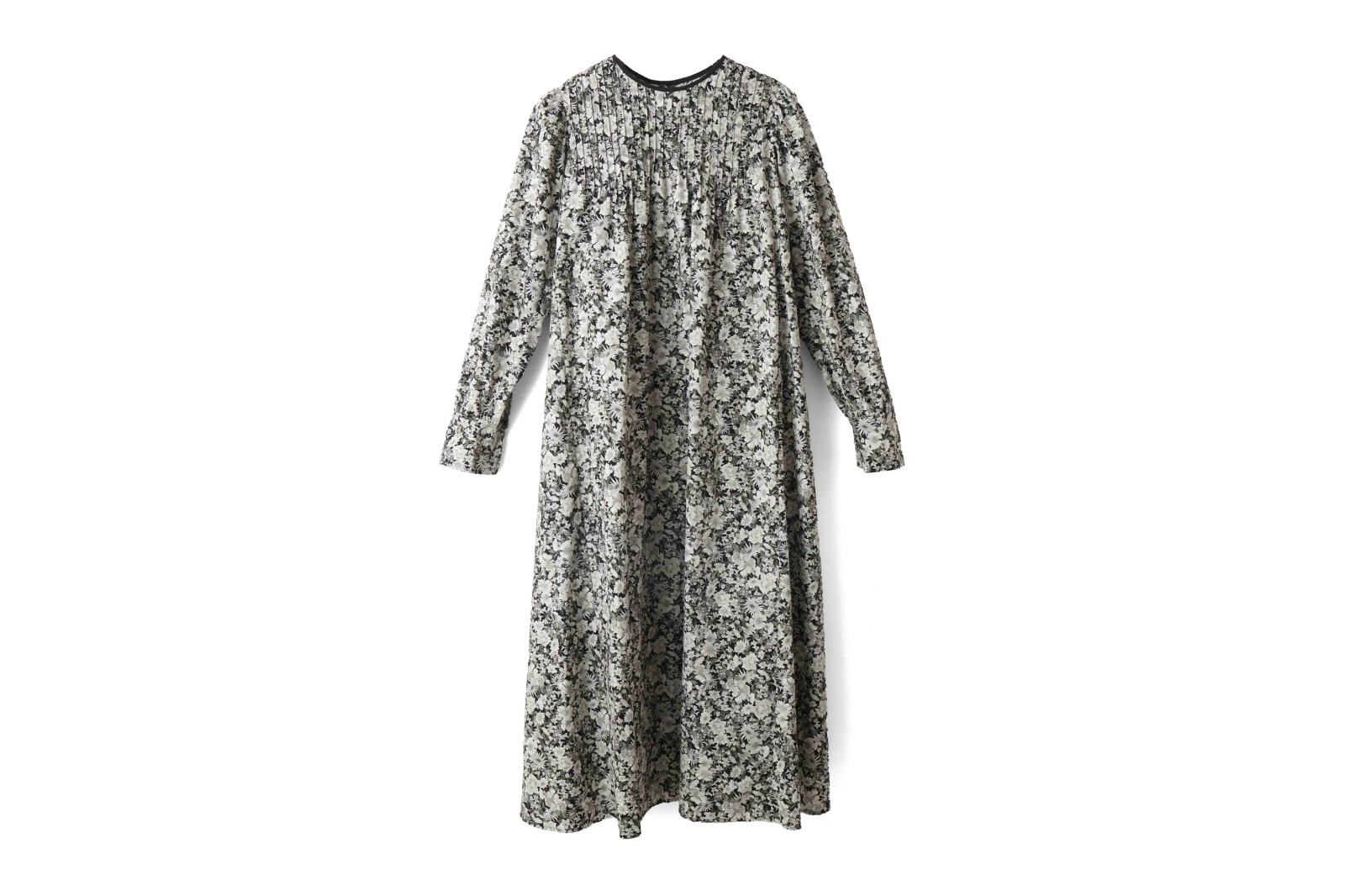 YAB-YUM定番のスカルプターワンピース。古い時代の彫刻家からインスパイアされた、前後の胸元に繊細なピンタックが並んだロング丈のワンピースです。後ろ開きでワンピースとして、前開きで羽織物としてもお召しいただけます。今シーズンはYAB-YUMでは新鮮な小花柄、衿の黒いパイピングがアクセントになっています。