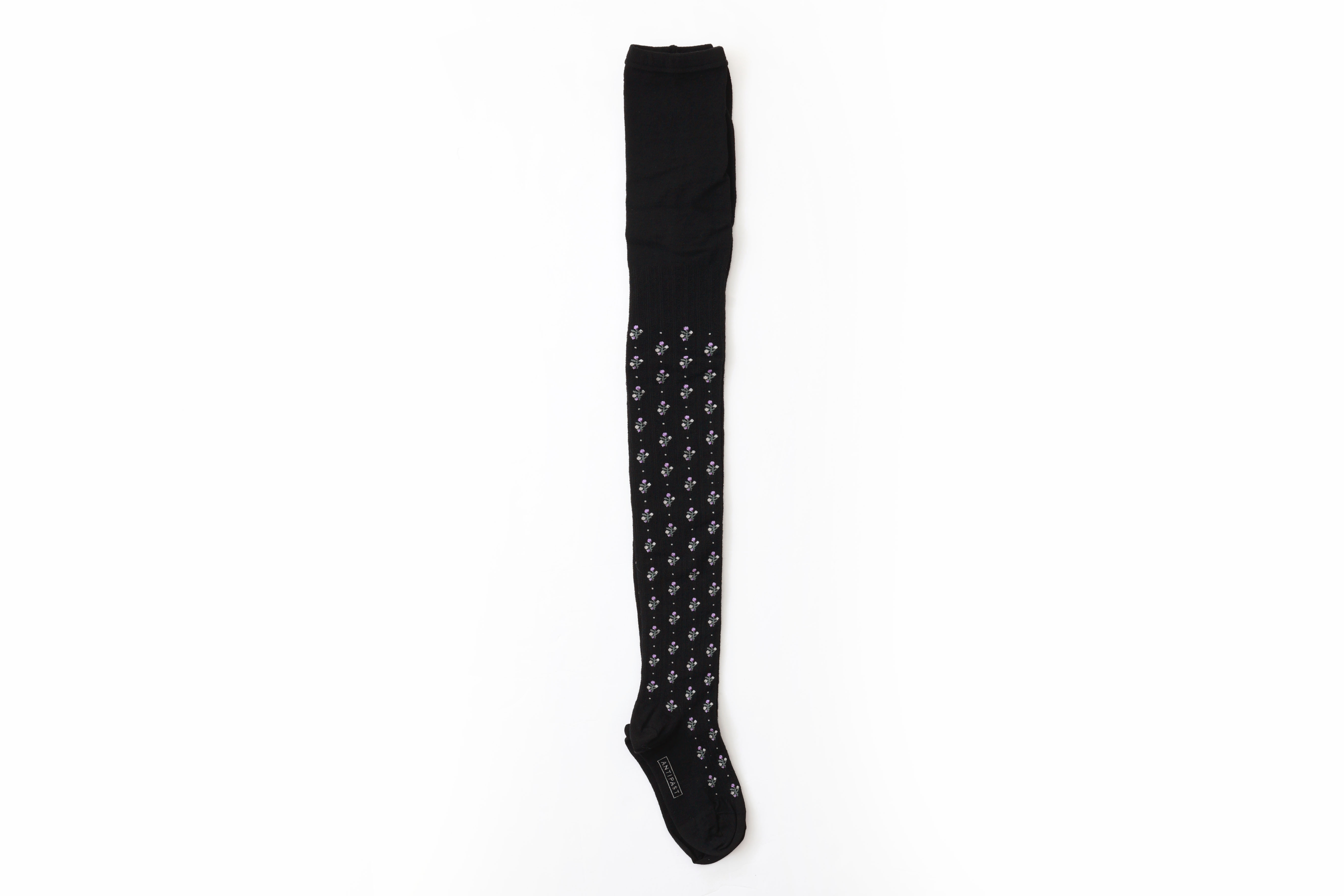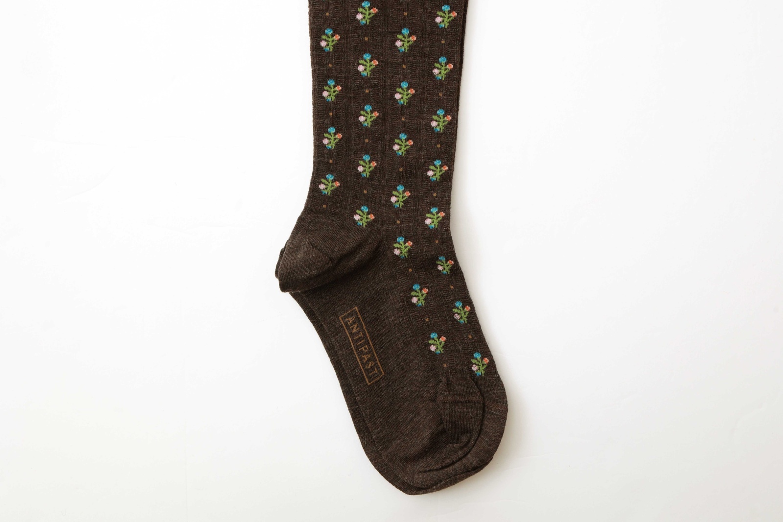 ストライプの編地に小花柄がデザインされたウール素材のタイツ。
