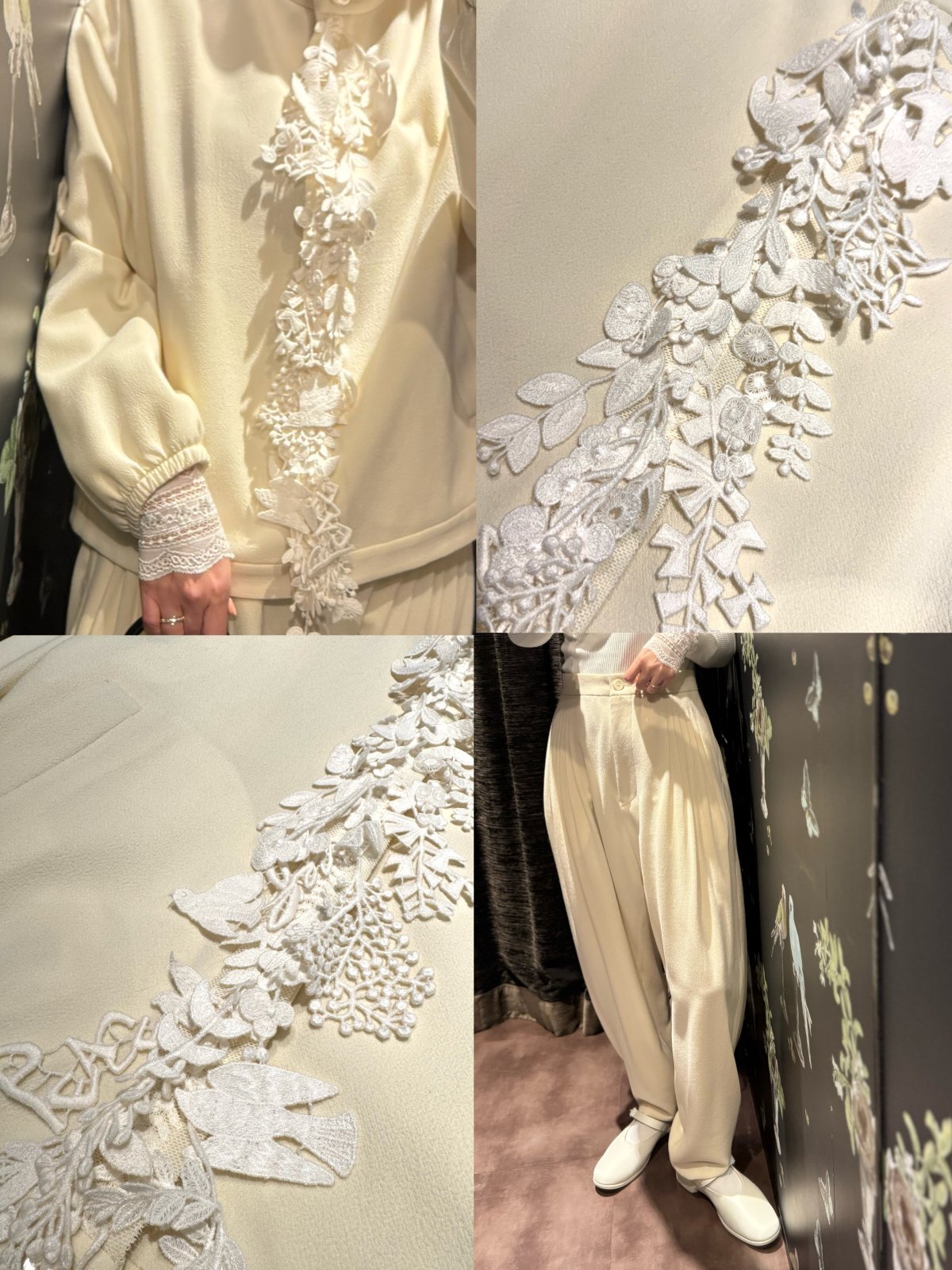| 商品説明 | 森に息づく草木や風など、森の中のモチーフをパーツにした“forest parade(フォレスト パレード)”のレースがフロントにあしらわれたブルゾン。強撚ウール糸で織り上げられたシボ感のある生地は、粒子の粗い砂糖のような風合いです。どこか懐かしく、ぬくもりを感じさせる表情が魅力。ほどよく身体に沿うクラシカルなシルエットに仕立てられています。 セットアップで着用できる同素材のパンツ「crystal sugar パンツ (AES4657」もございます。 |
