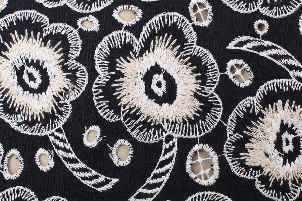 生地いっぱいにお花の刺繍が浮かぶ“candy flower(キャンディー フラワー)”。花の茎をキャンディーのスティックのような斜めボーダーで描いた、遊び心のある刺繍のテキスタイルです。花芯部分は刺繍糸を重ねてふくらみと奥行きを持たせた立体的な表現に、花々の周りにはボーラー刺繍を散りばめました。手仕事を思わせるような素朴なステッチが、あたたかみのある表情を添えています。 |
