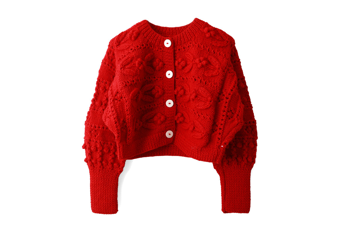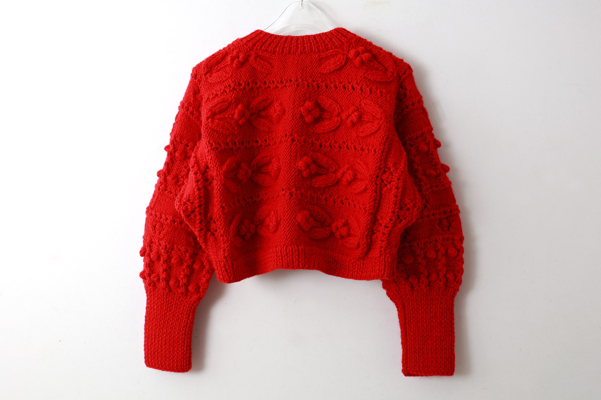 ぽこぽことした立体的な編みや透かしなどさまざまな編地が組み合わさったノスタルジックなニットカーディガン。