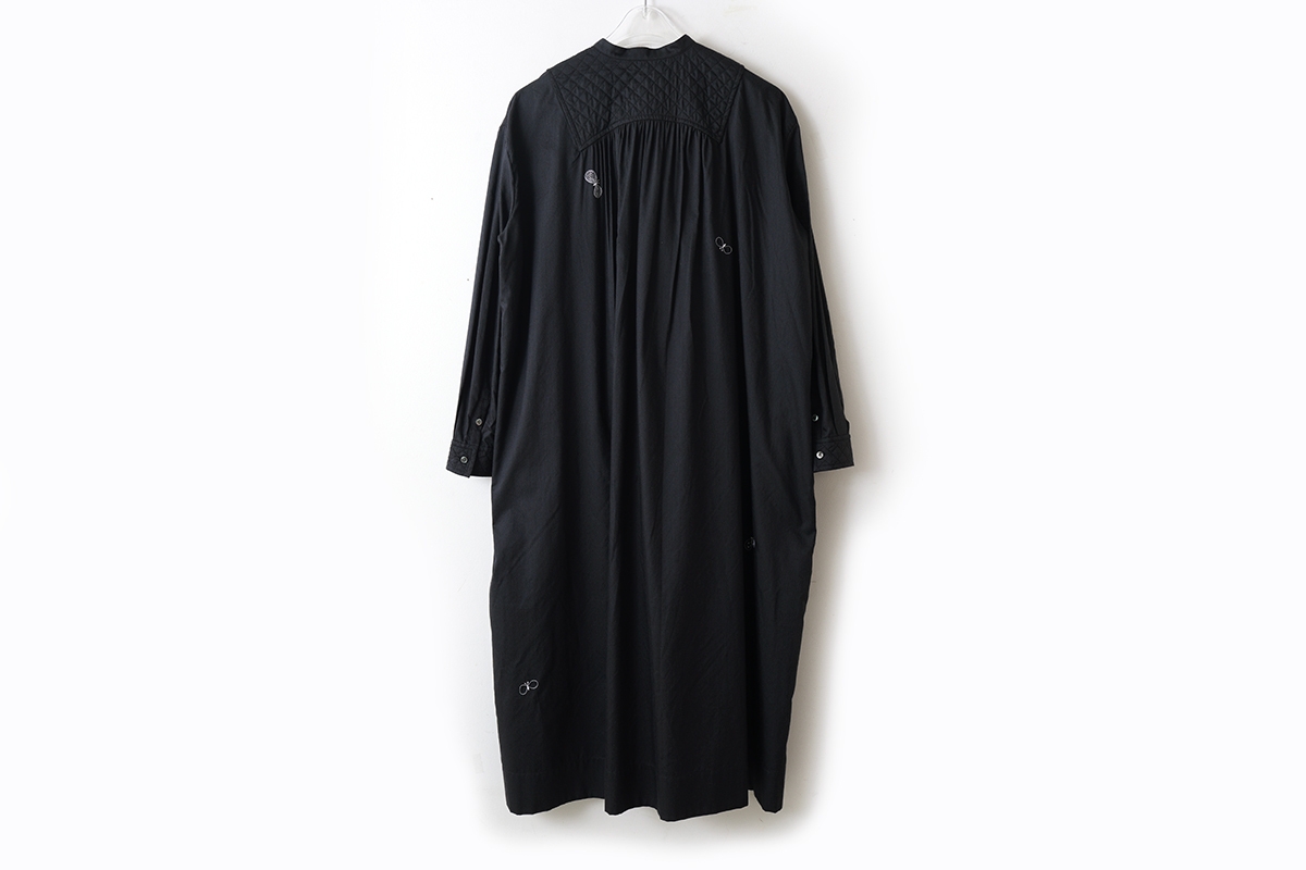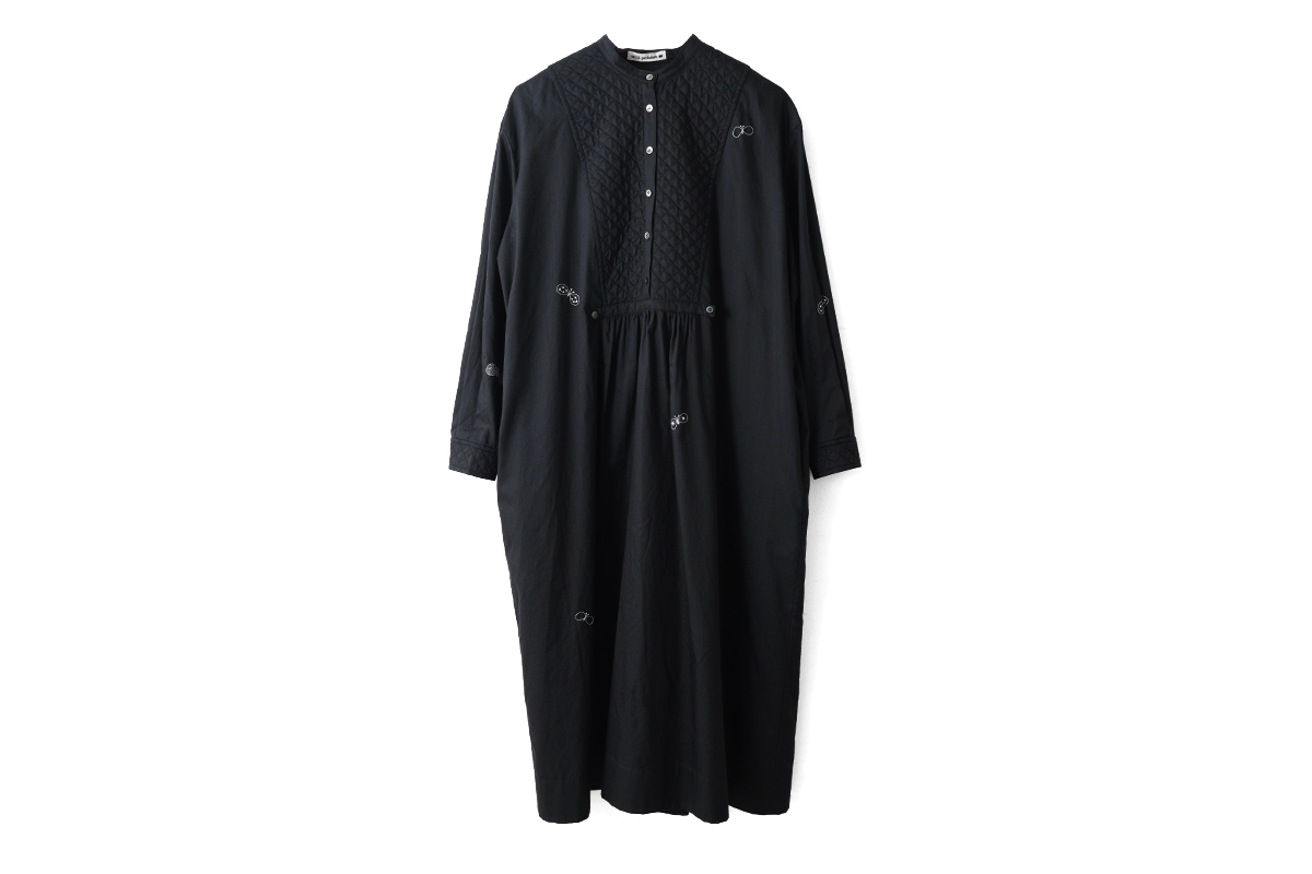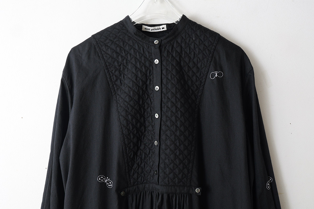 | 生地の中をふわりとちょうちょが舞う“choucho(チョウチョ)”。生地の中に蝶が舞い、衣服の中に空間や動きを感じられるようなテキスタイルです。経糸にシルク、緯糸にシルクウールの混紡糸が使用しされたジョーゼット生地で作られたドレス。ヨークとカフスにキルティング加工が施されており、クラシカルな表情を添えています。粒子を感じられるドライな風合いの生地が、装いを静かに彩ります。 |