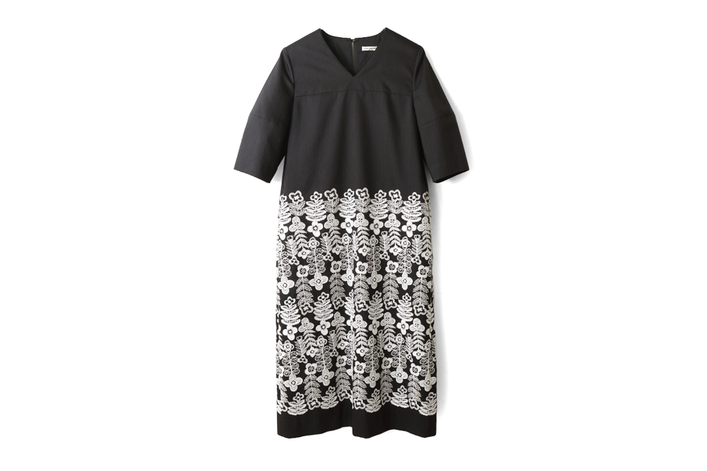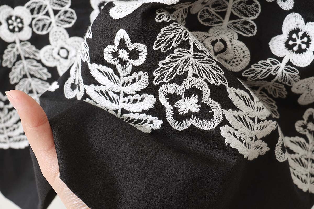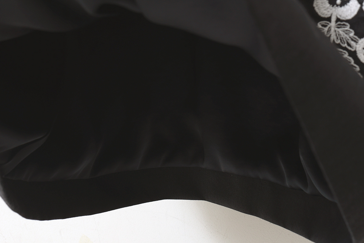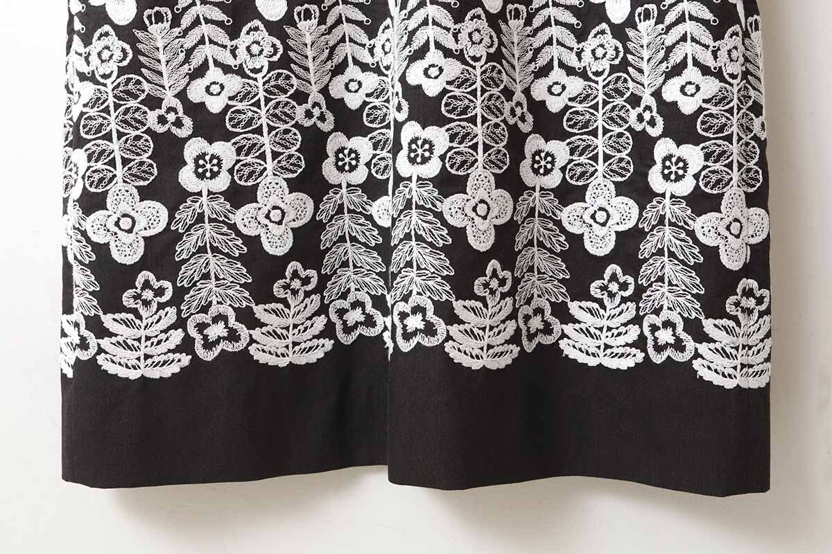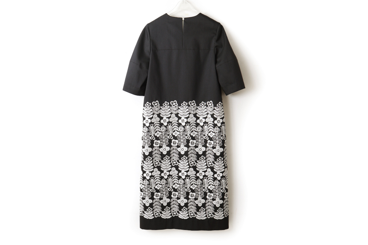 | 細かなラインで描かれた草花の刺繍が広がる“swing garden(スイング ガーデン)”。満開の花々が、葉や花びらが触れ合うほどぎゅっと身を寄せながら風に揺れています。自然の風景のように、花々が重なる刺繍表現は、職人の技術と経験によるもの。緻密に描かれたデザインと、刺繍の意匠が融合した華やかな図案です。経糸にシルク、緯糸にシルクウールの混紡糸を使用したジョーゼット地に、刺繍が施されたドレス。ボリュームのあるランタンスリーブがアクセントとなっています。 |