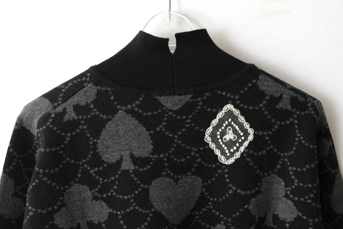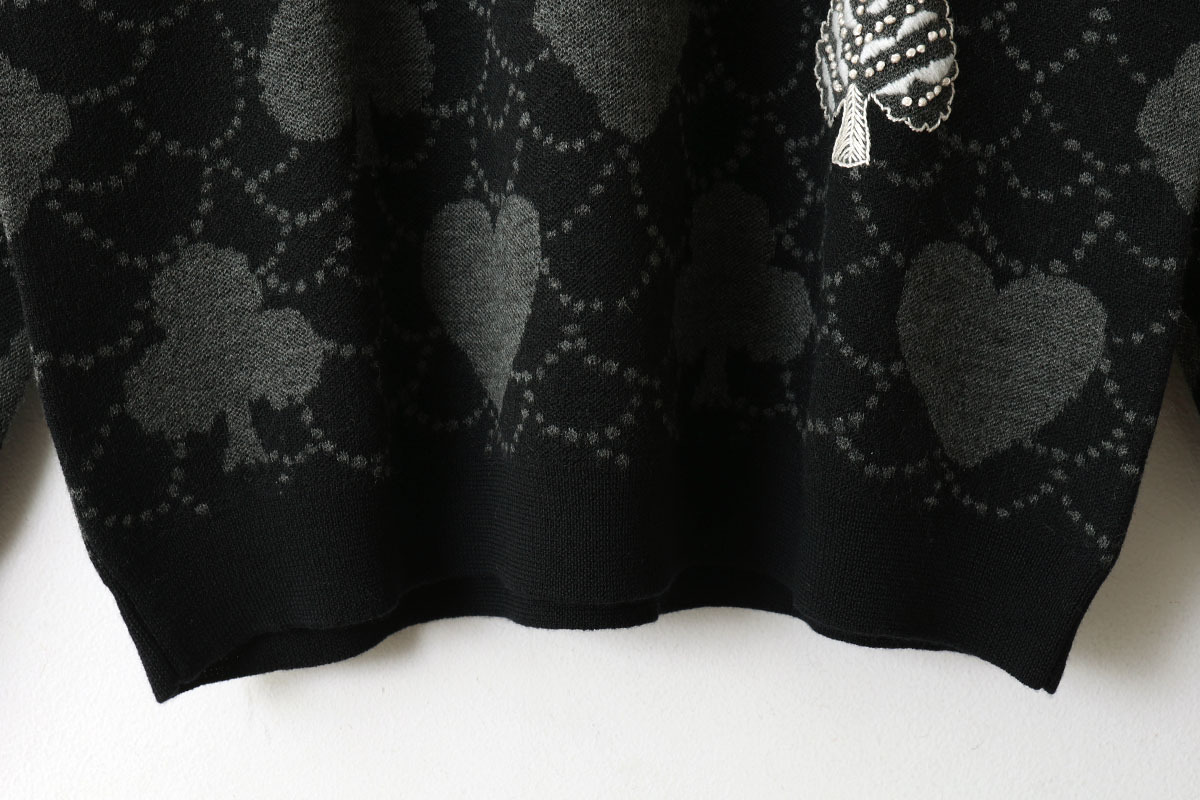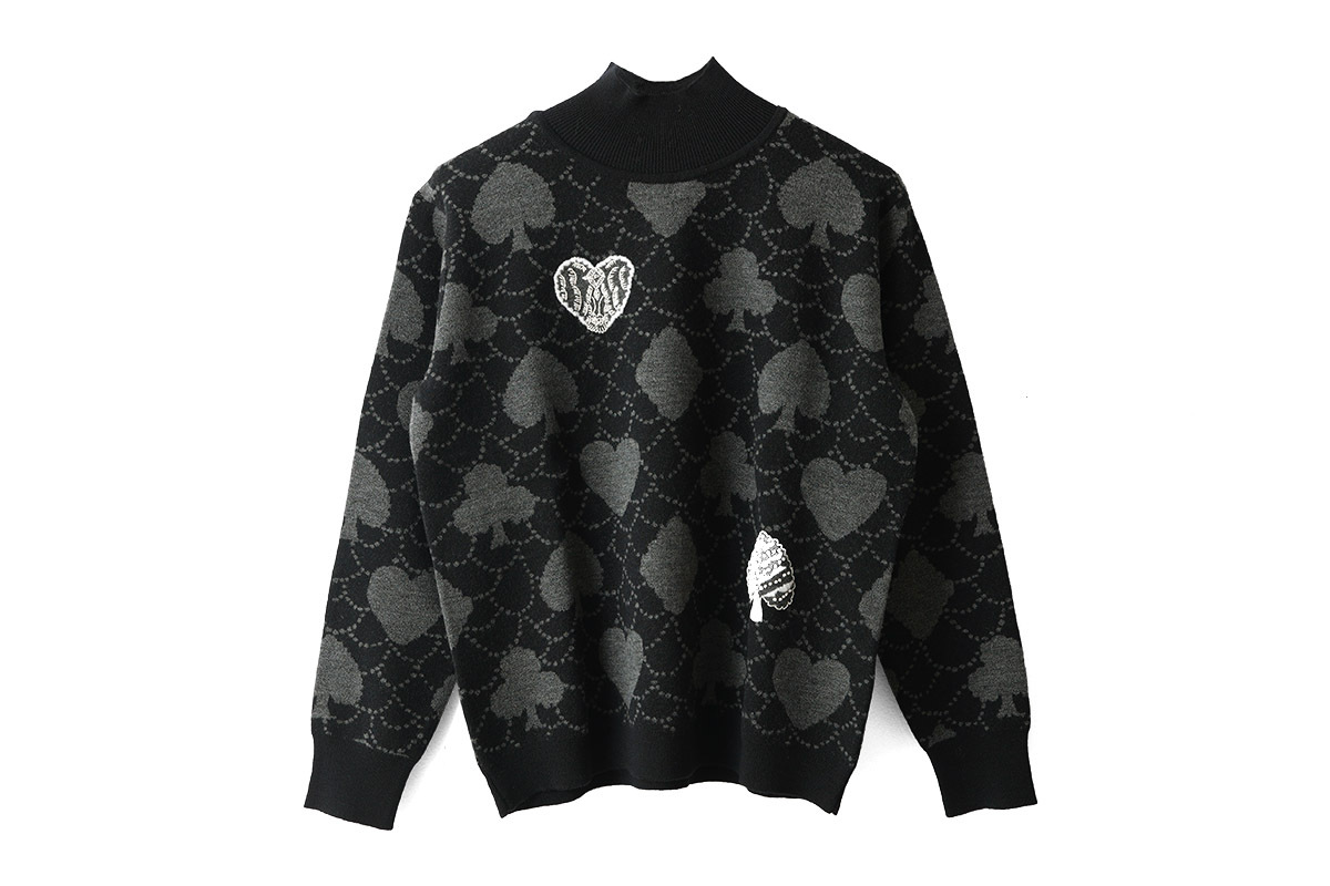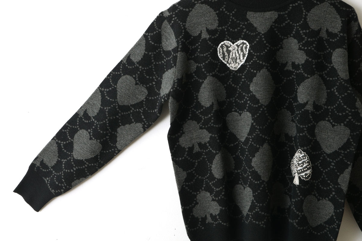 | トランプのモチーフに森の情景を映した“forest card(フォレスト カード)”のプルオーバー。ジャカード編みのニットに、縫い留めた刺繍のモチーフが4つ浮かびます。刺繍は2種類の糸を使用し、立体的な表情に。部分的に手刺繍を織り交ぜ、クラフト感のある表情に仕上げられています。アイコニックなフォルムの中に、別世界が広がっているような、幻想的な雰囲気が漂うデザイン。カシミヤのように柔らかな質感のウール素材で編み上げ、落ち着いた艶が表面に広がります。 |