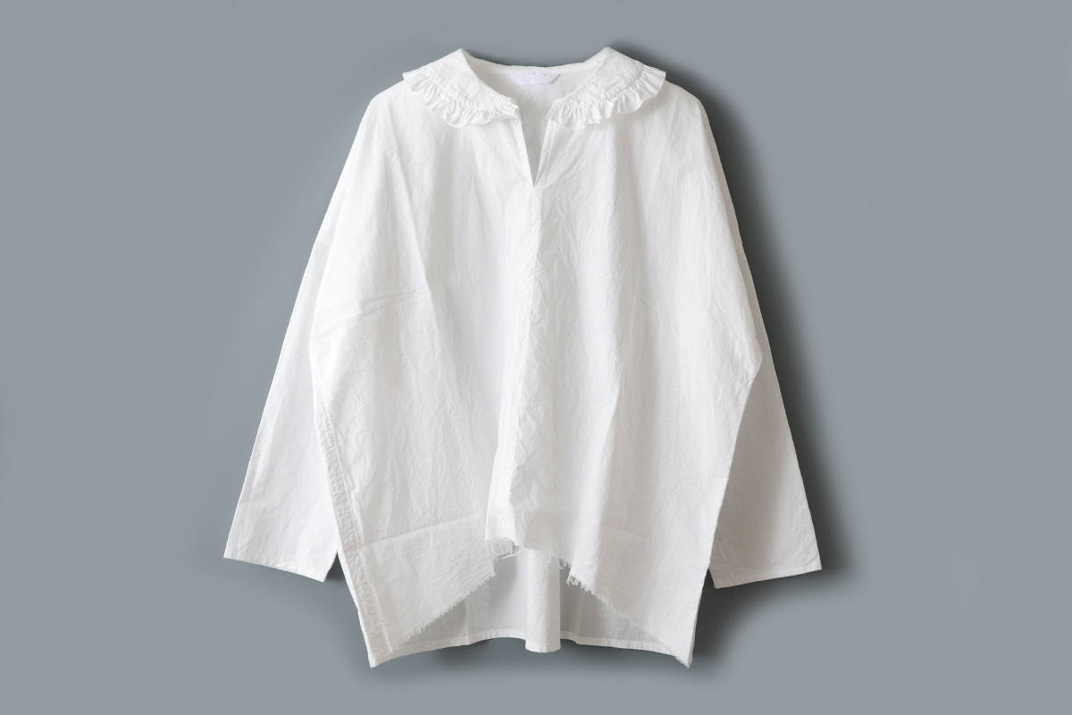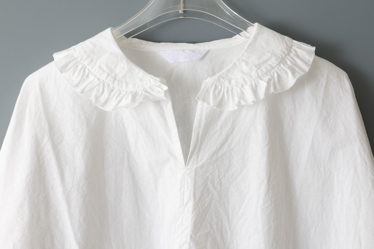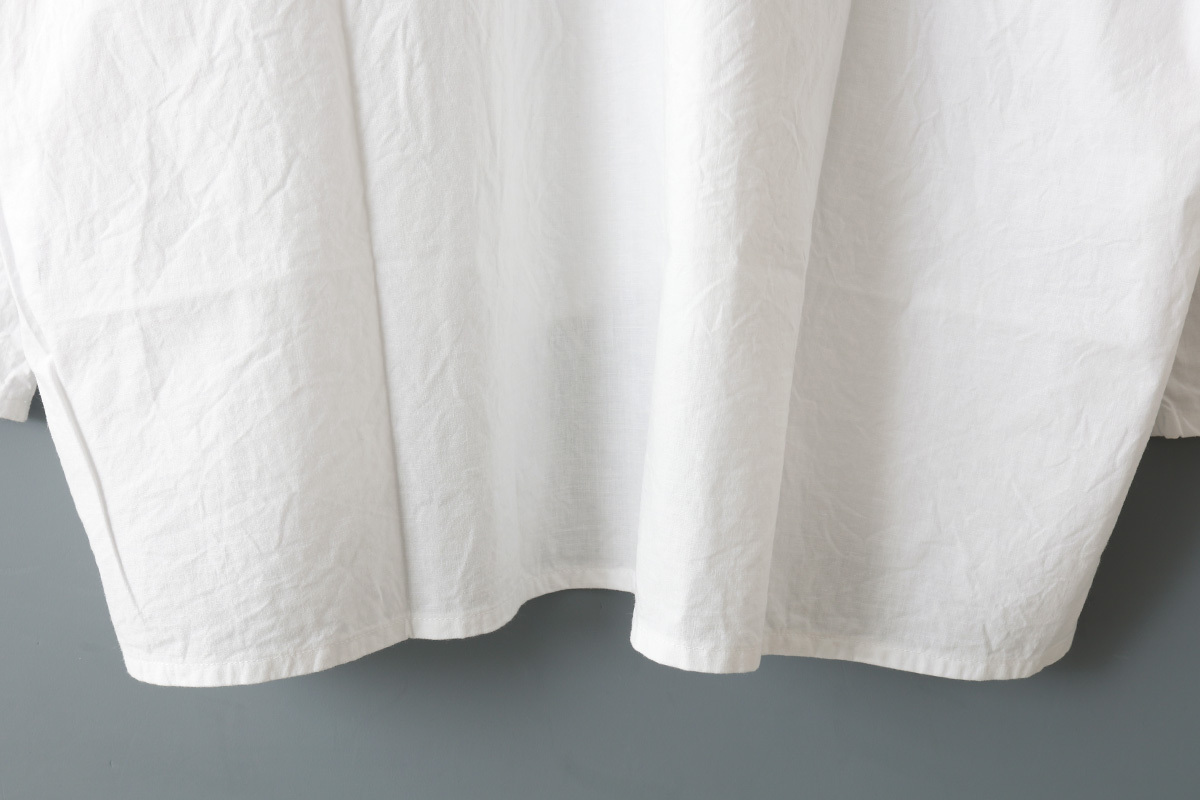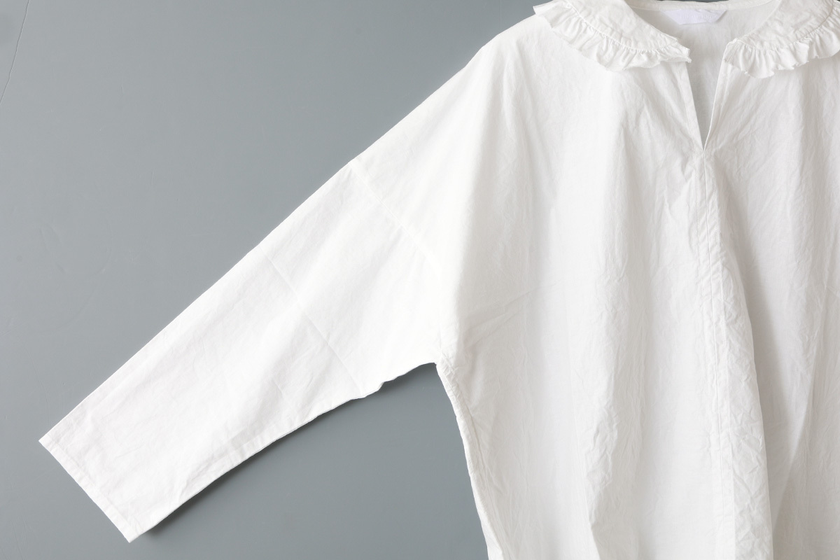 ややハリ感のあるコットン100%の軽い生地感のブラウス。お尻が隠れる丈感と切りっぱなしの裾がポイントで、トップスアウトでの着用がおすすめです。控えめなVネックからインナーをちらりと見せても。