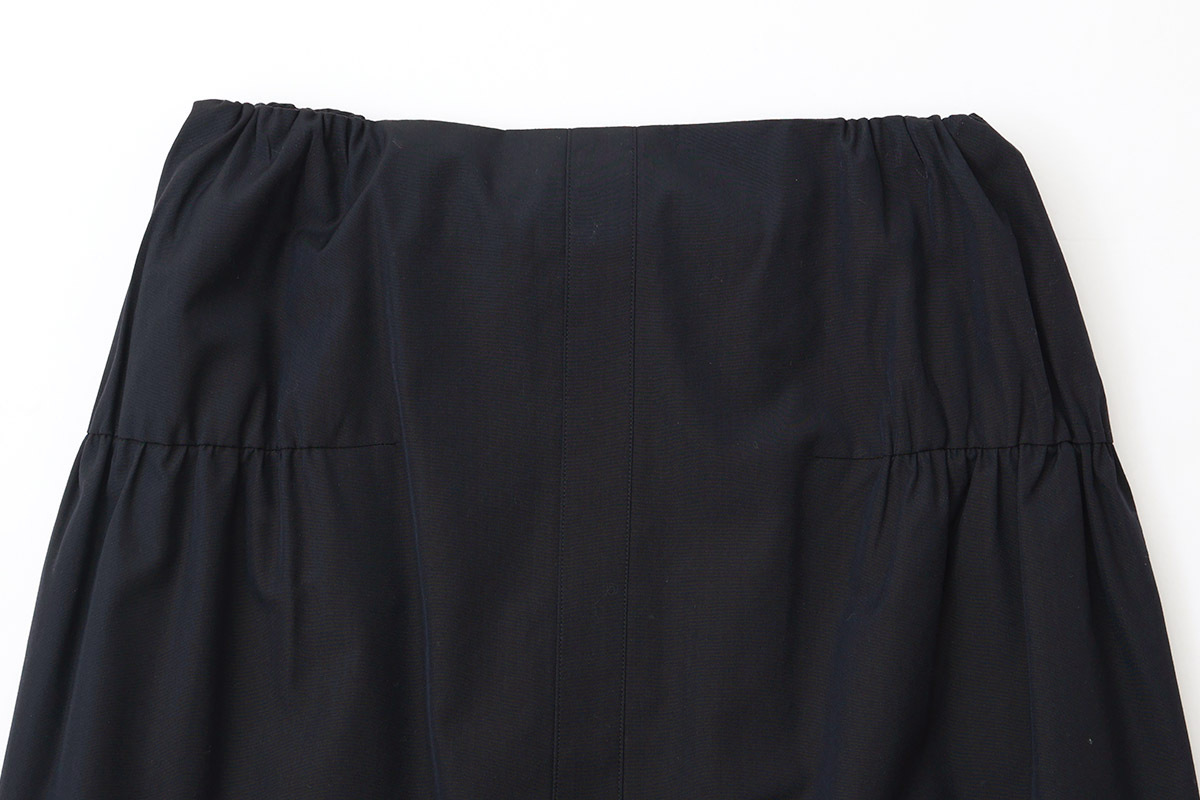 フラットな生地に、部分的にギャザーを寄せて立体的なシルエットになるよう作られたスカート。サイドと、背面にボリュームを出して、ミニマムなムードの中に柔らかな表情が加えられています。オフィスシーンでの着用など、落ち着いた雰囲気でお召しいただけます。 |