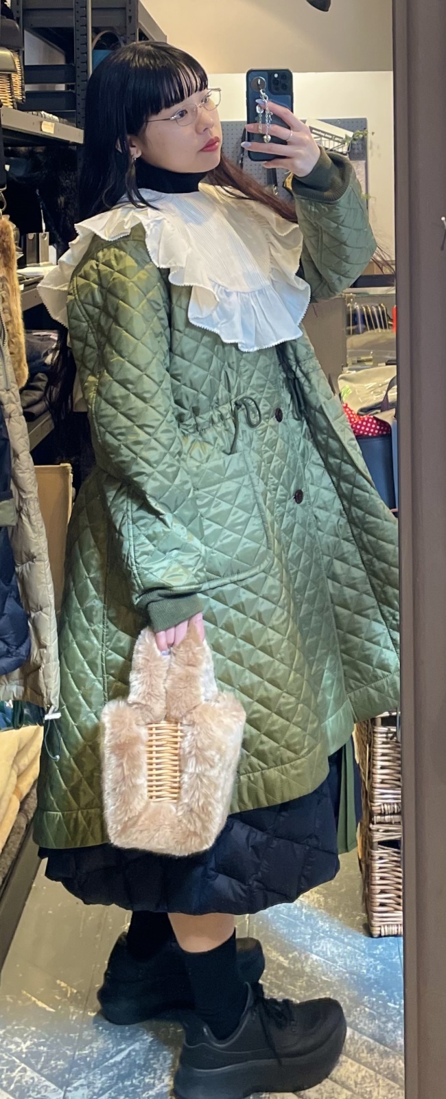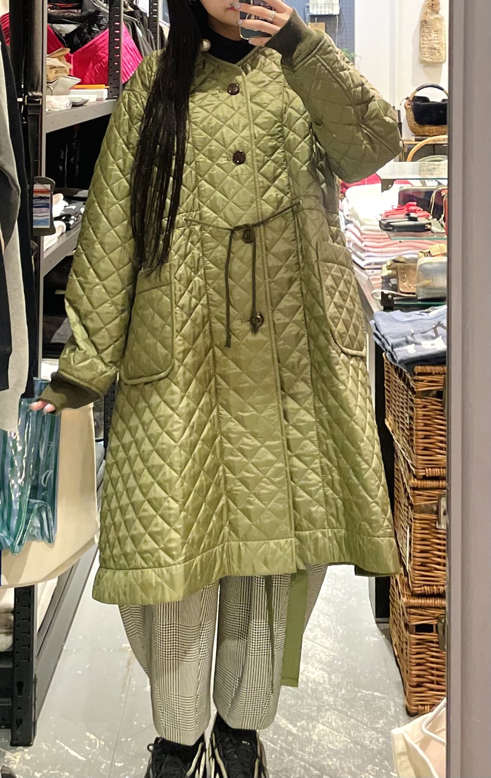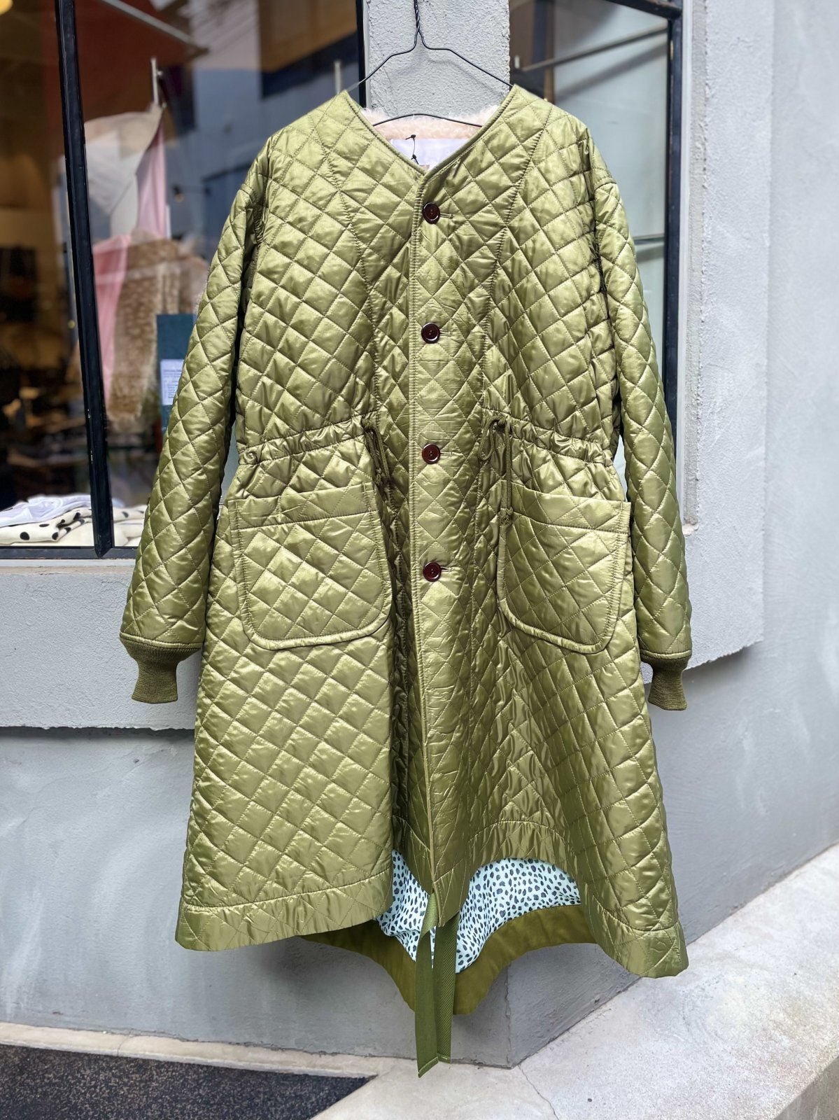 中わた入りのキルティングコート。ちらっと見える裏地にはかわいいアニマル柄が施されています。首元にはボアが付いており、防寒力も抜群です。ウエストと裾についたドローコードを引っ張ると、また違ったシルエットがお楽しみいただけます。裏返しての着用もおすすめです。