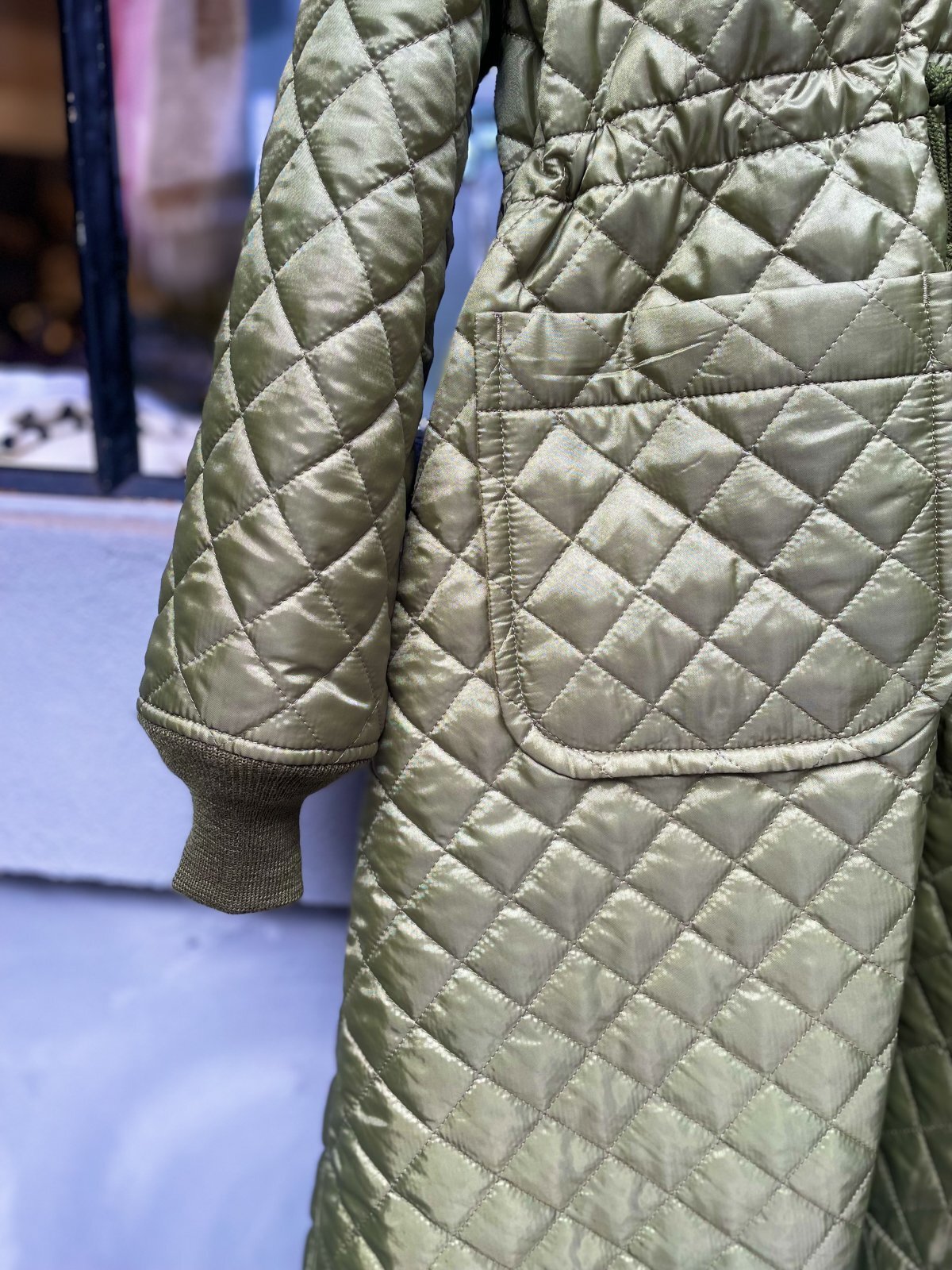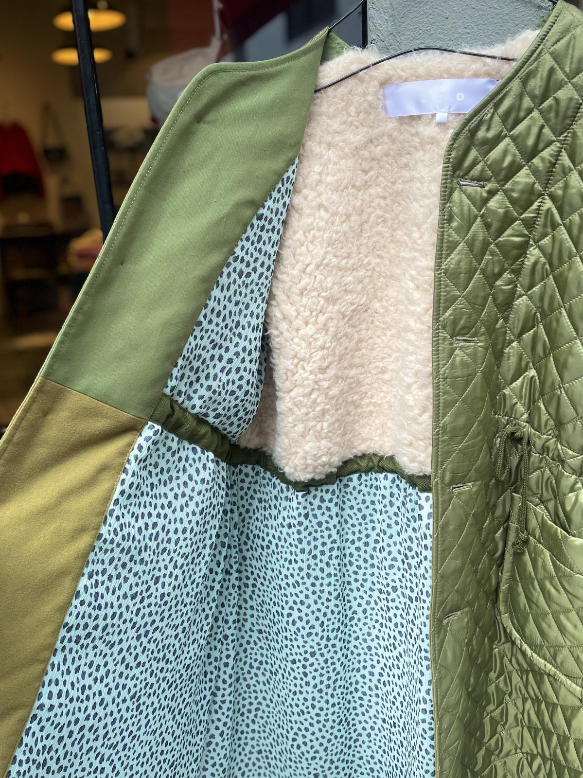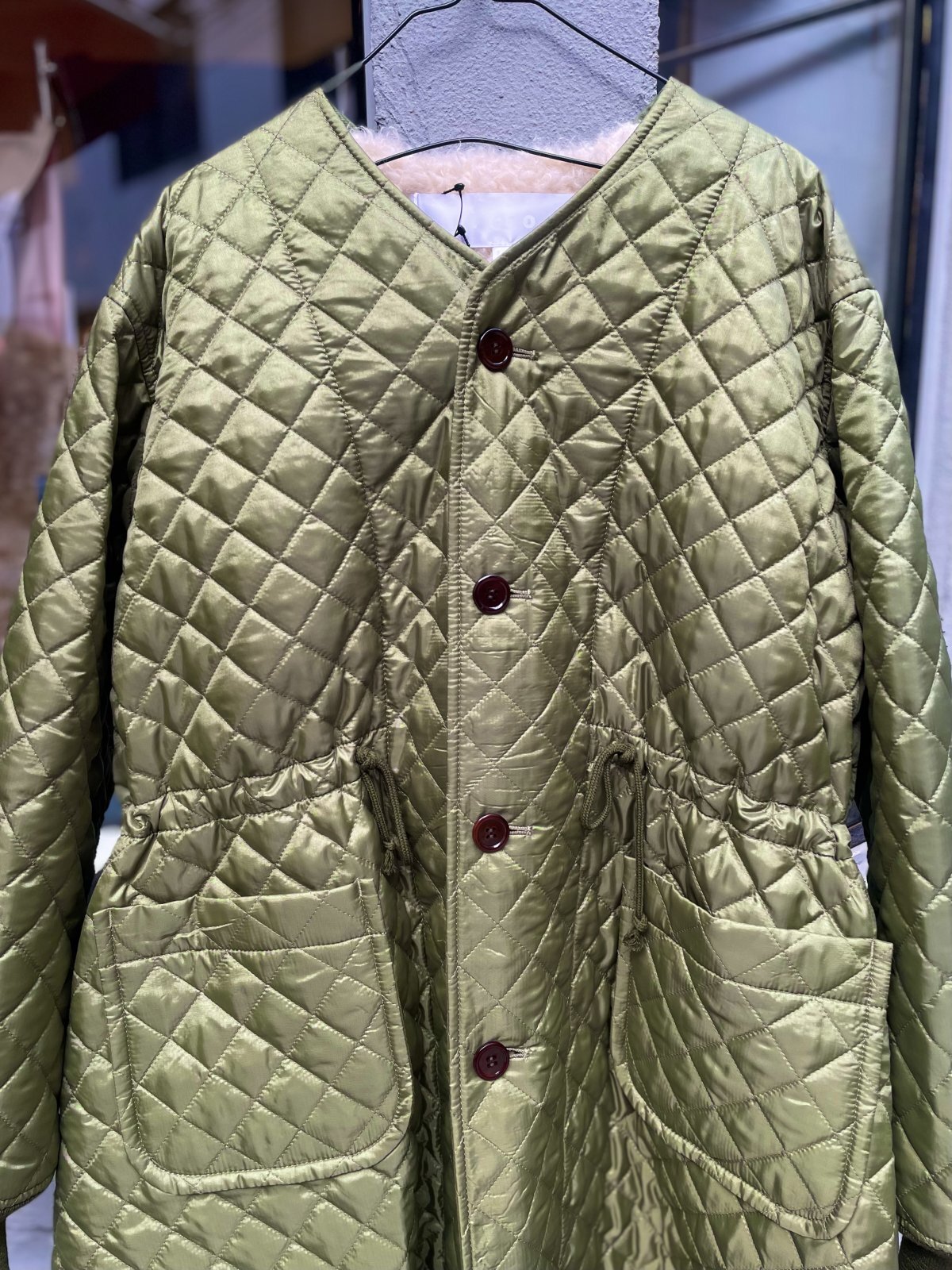 中わた入りのキルティングコート。ちらっと見える裏地にはかわいいアニマル柄が施されています。首元にはボアが付いており、防寒力も抜群です。ウエストと裾についたドローコードを引っ張ると、また違ったシルエットがお楽しみいただけます。裏返しての着用もおすすめです。