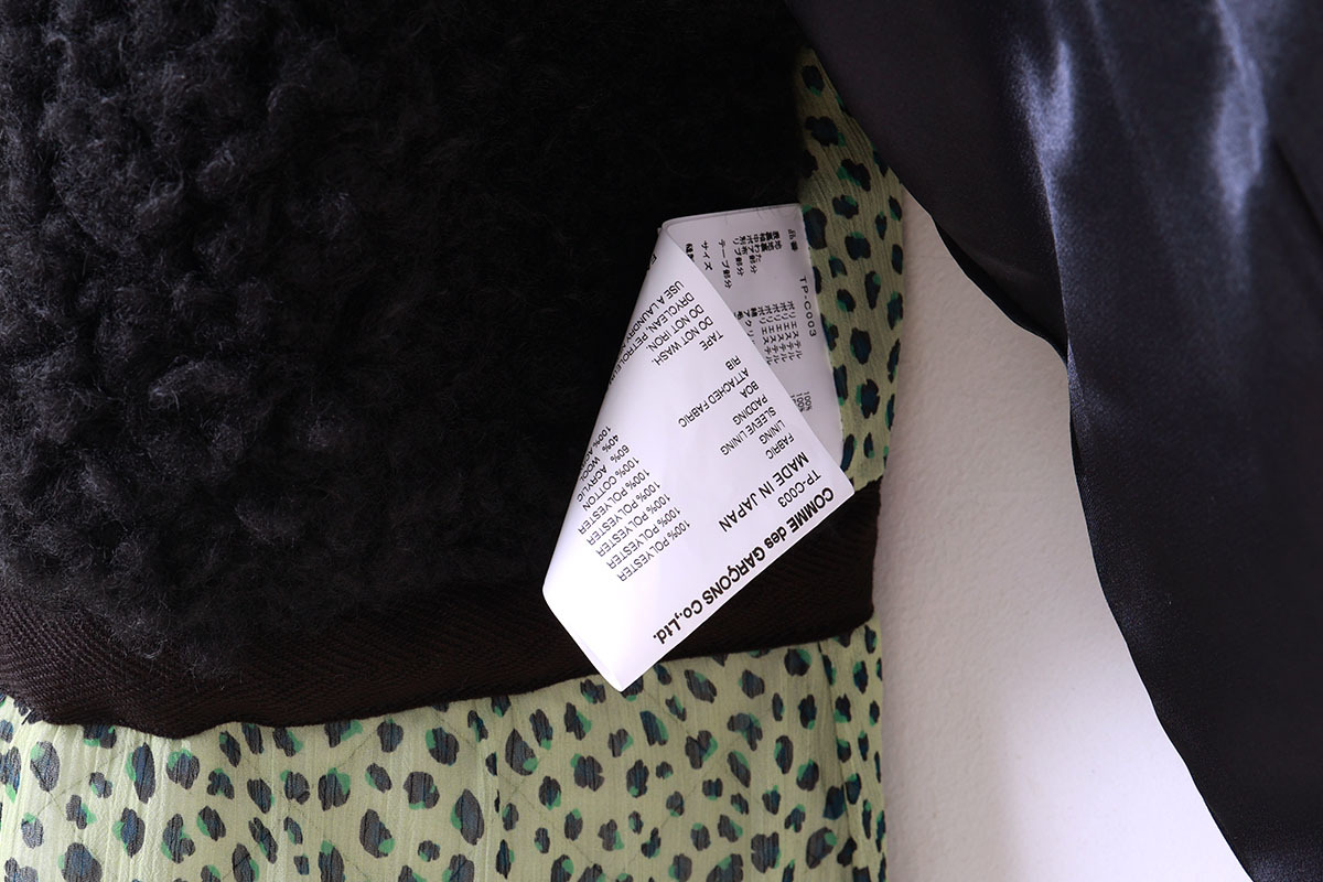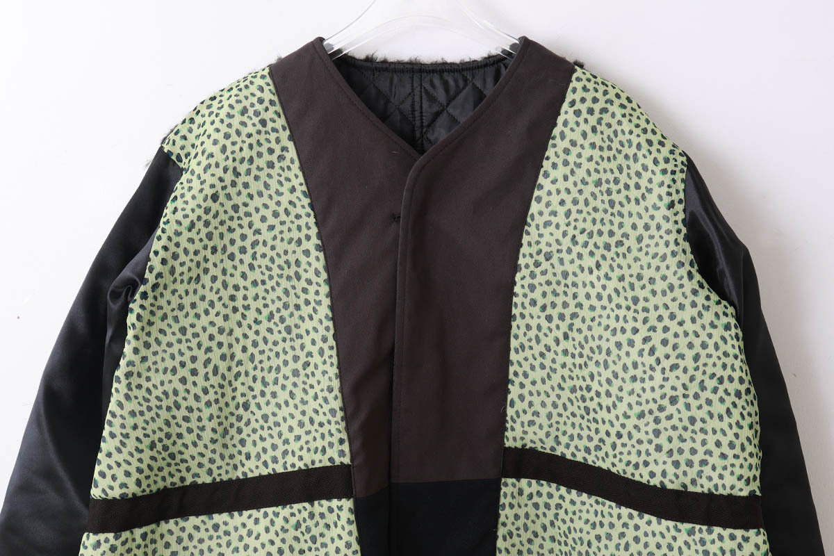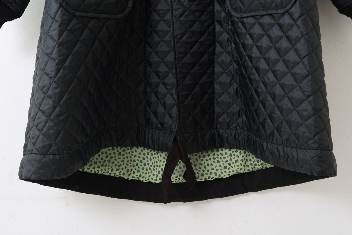 中わた入りのキルティングコート。ちらっと見える裏地にはかわいいアニマル柄が施されています。首元にはボアが付いており、防寒力も抜群です。ウエストと裾についたドローコードを引っ張ると、また違ったシルエットがお楽しみいただけます。裏返しての着用もおすすめです。