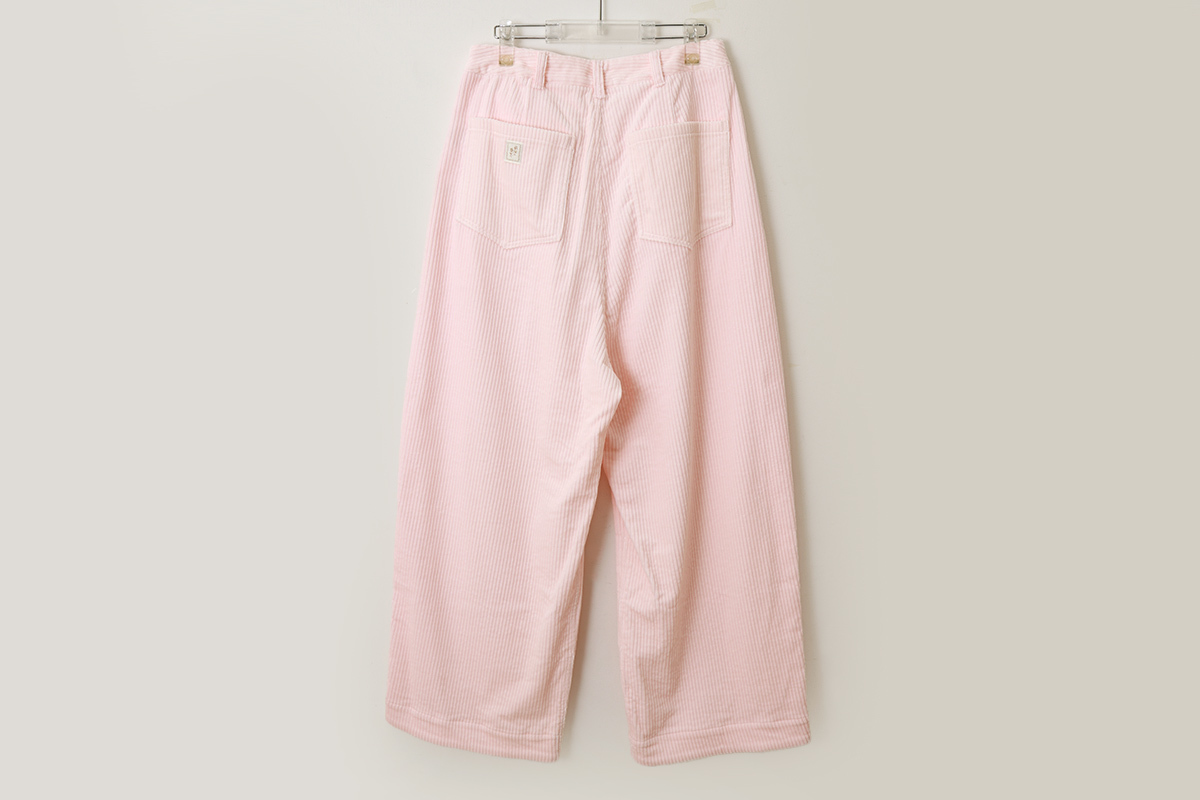 太畝のコーデュロイパンツ。後ろポケットの金糸のオリジナルタグとポケット口のシルバーのハンドステッチがポイントに。フロントに4つのタックが入っており、ゆったりとしながらもすっきりとしたシルエットです。裾には、折り返しやすいように見返しがつけられています。