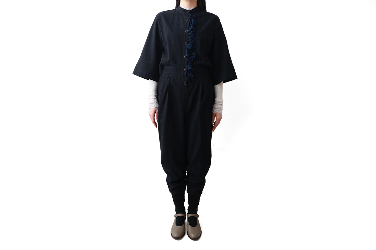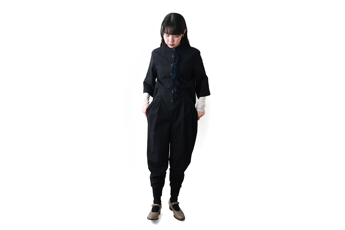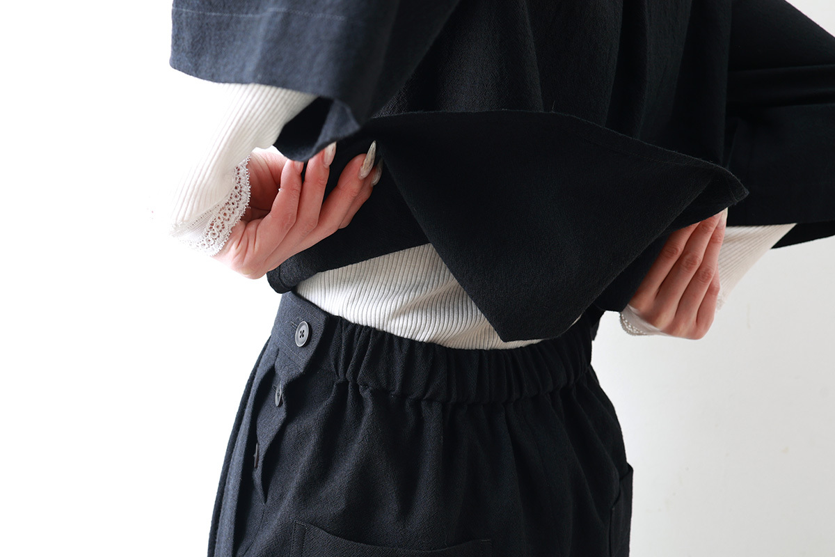 | フロントに“forest parade”のレースが添えられたウール100%のあたたかさを感じる生地感のコンビネゾン。ミニマムなデザインのコンビネゾンは、前身頃は繋がっていますが、後ろ身頃はウエスト部分で切り離されており、セットアップのようなシルエットでお召しいただけます。後ろ身頃はウエストにインしてもアウトしてもご着用していただけます。 |