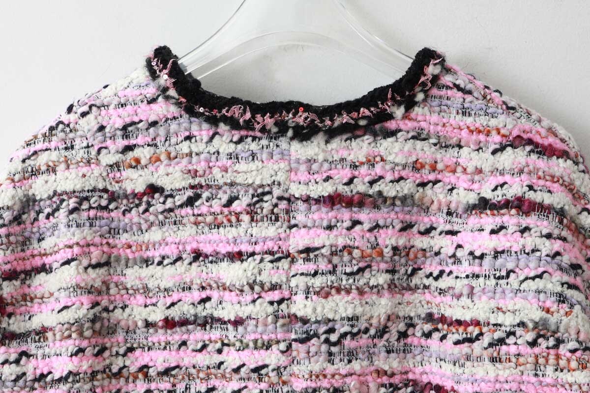 フランスのマリア・ケント(MALHIA KENT)社のツイードを使用したジャケットです。襟ぐりから前立て、袖口やポケット口のトリミングには全て手編みのブレードが施されており、細部にわたって丁寧な手仕事のぬくもりが感じられます。